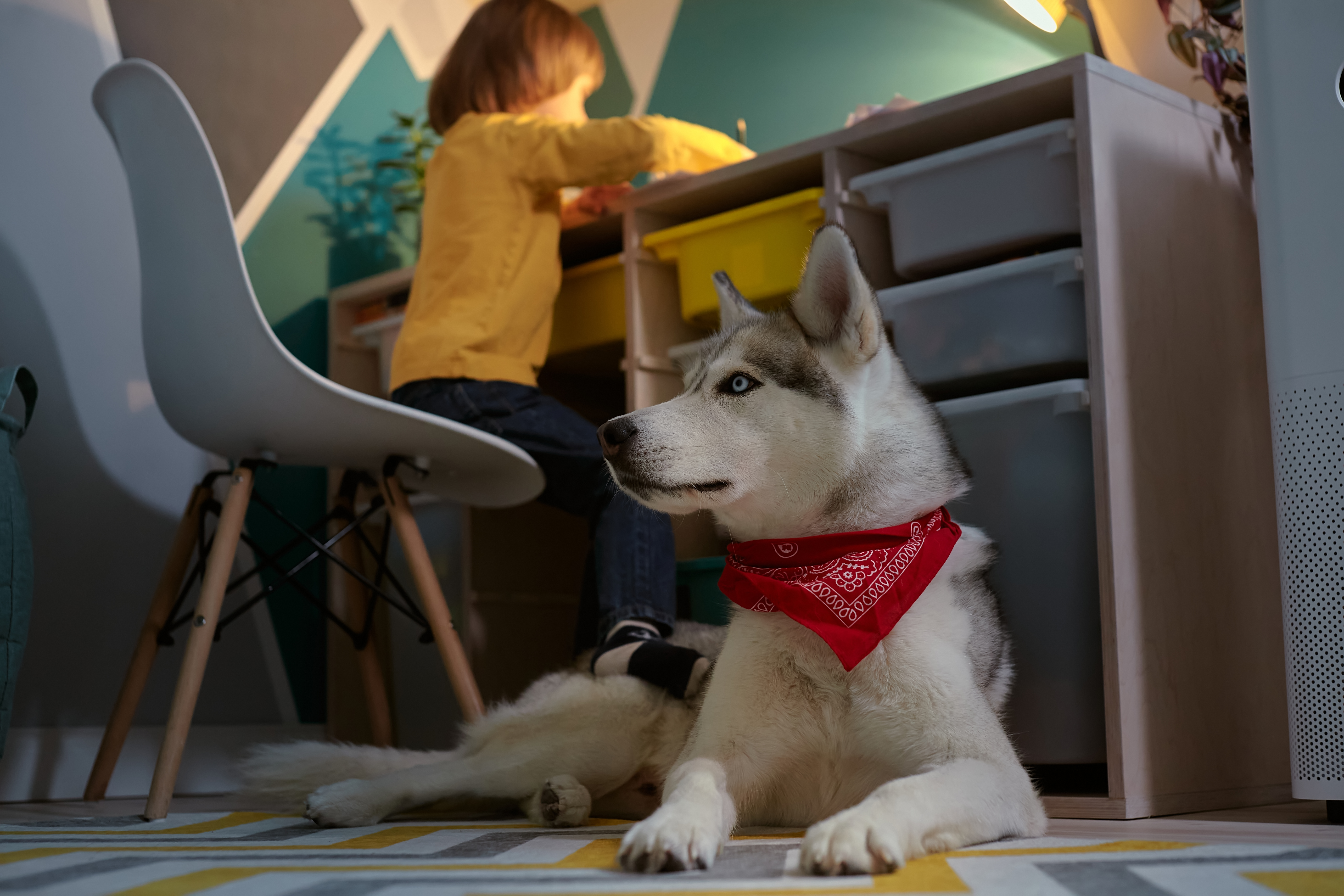 Child and pet dog together in the children's room. Photo Credit: Envato @perfectlab