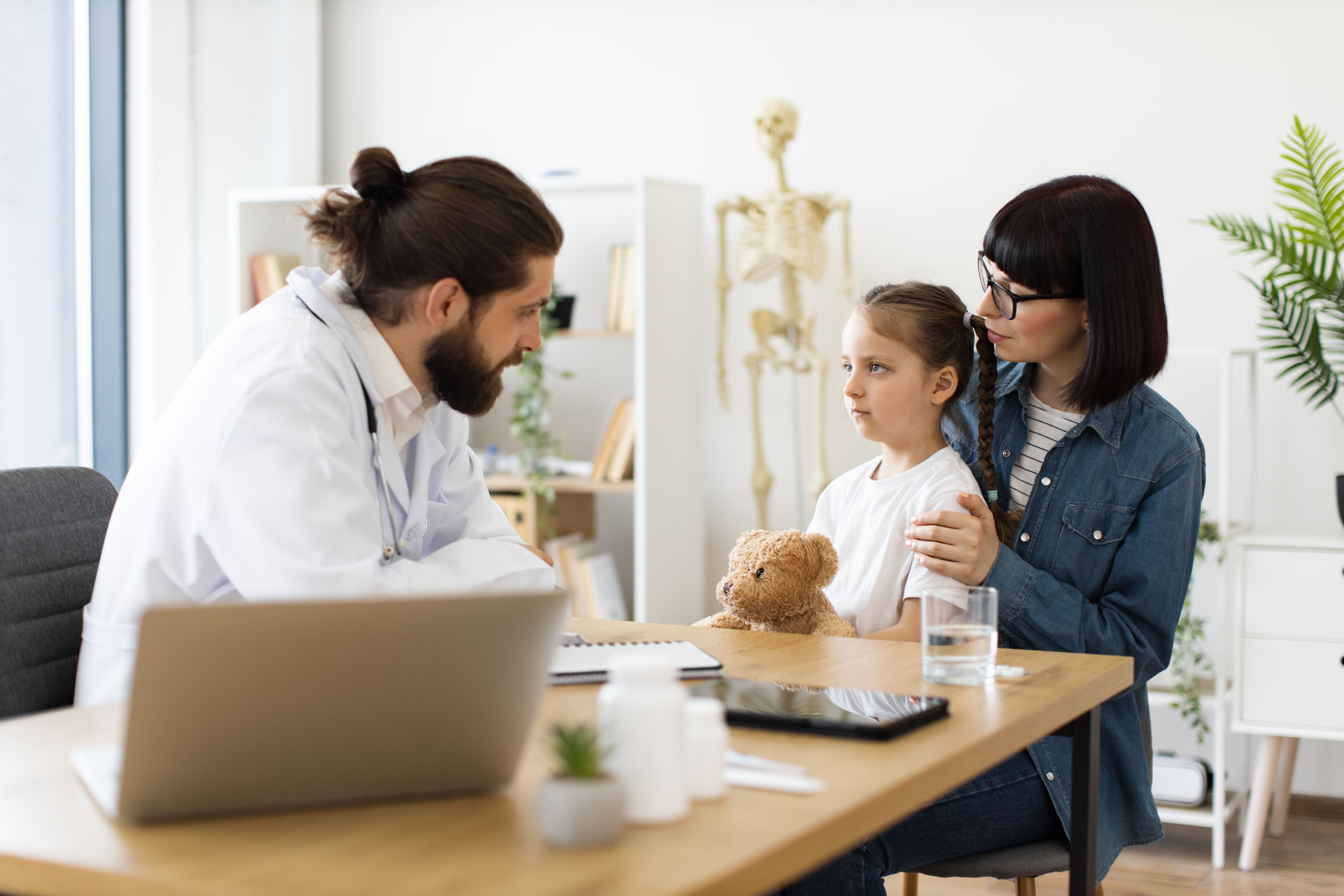 Doctor consulting young patient with parent in modern clinic. Photo Credit: Envato @sofiiashunkina