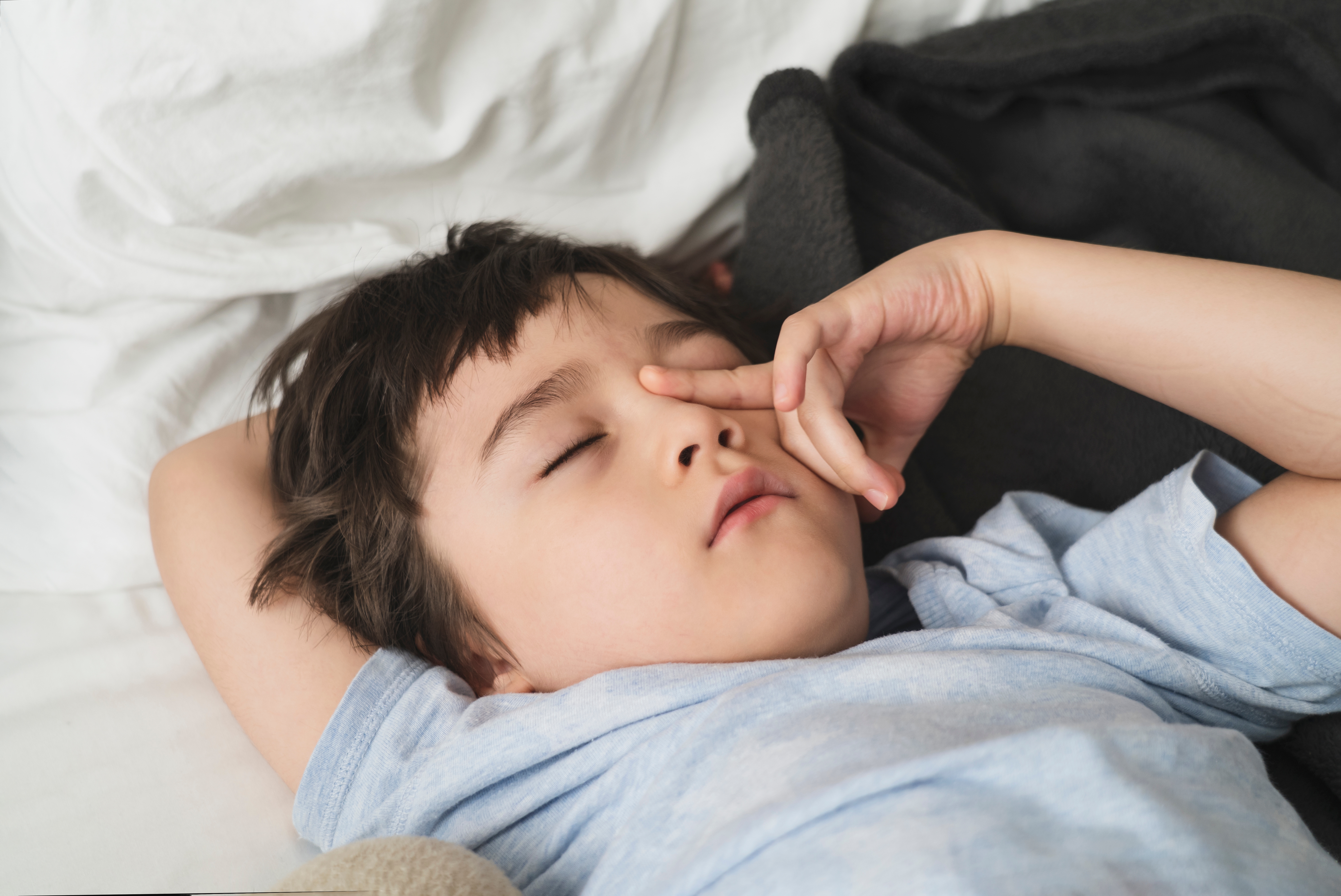 Toddler boy rubbing eyes,Kid wearing pajamas laying down on bed,Kid waking up in with unhappy face. Photo Credit: Envato @annann_9