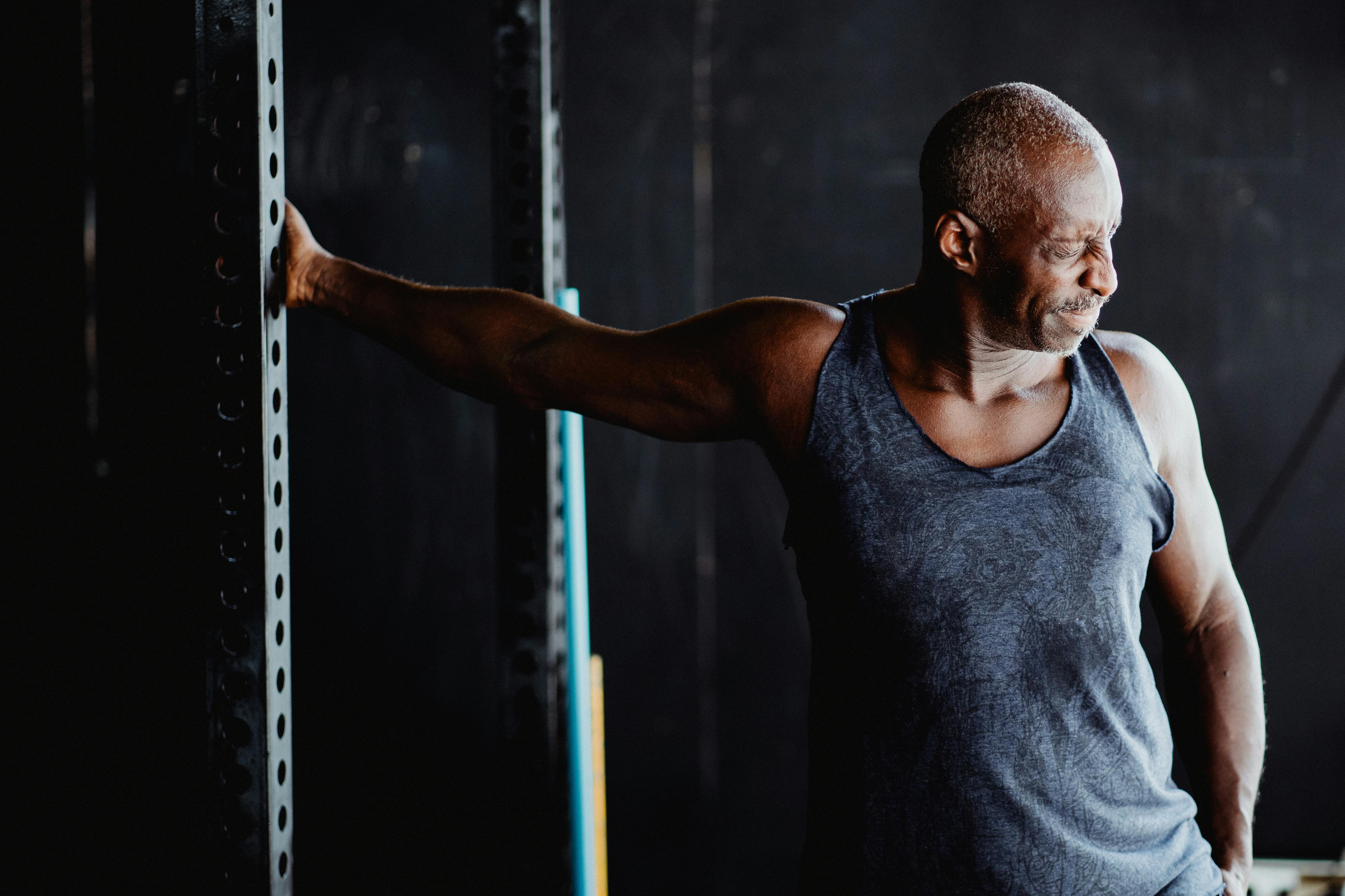 An elderly man in a gray tank top stretches indoors, representing fitness and a healthy lifestyle. Photo Credit: Pexels @Ketut Subiyanto