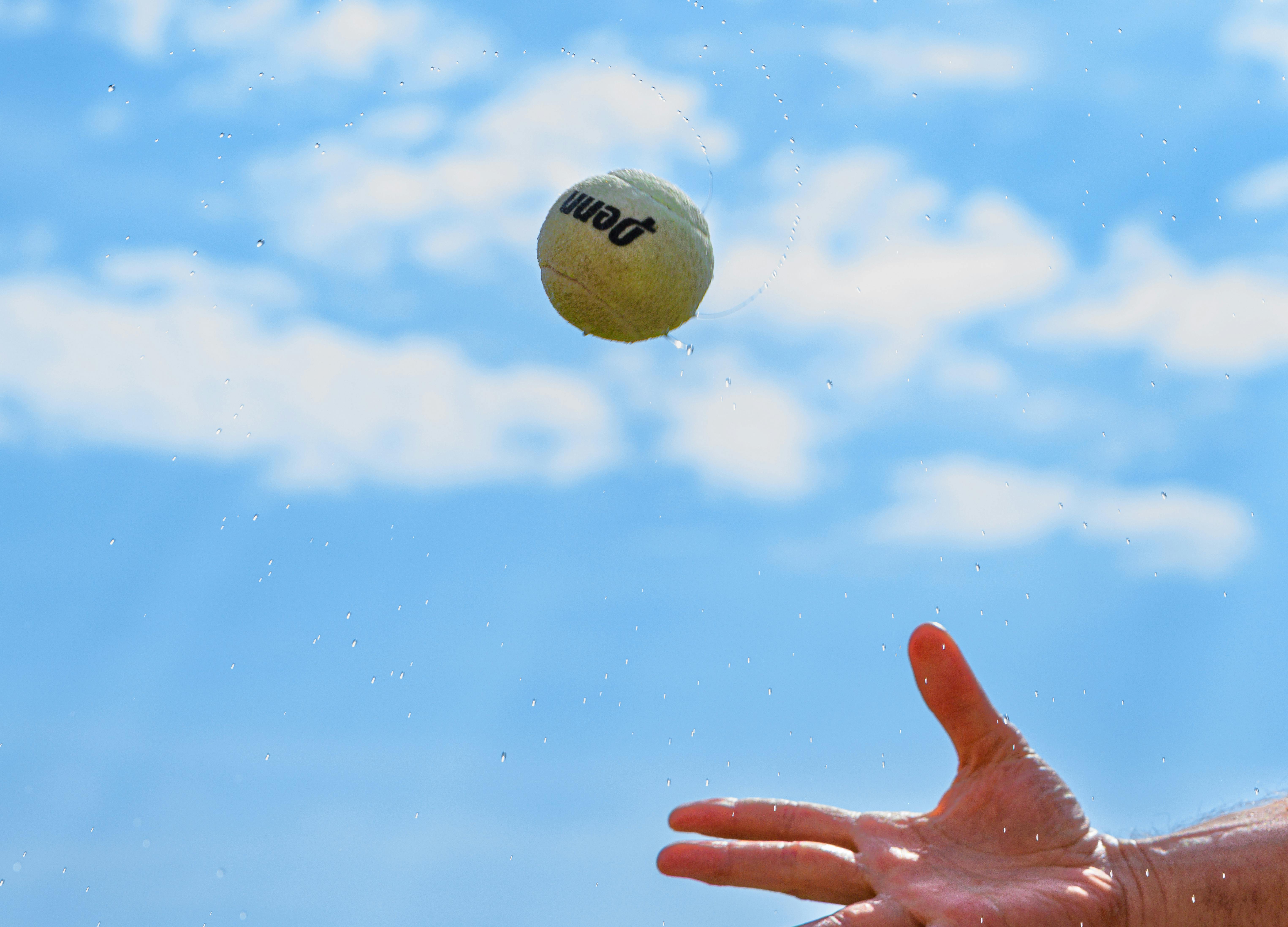 A tennis ball in motion captured mid-air against a clear blue sky with a hand reaching out. Photo Credit: Pexels @Jay Brand
