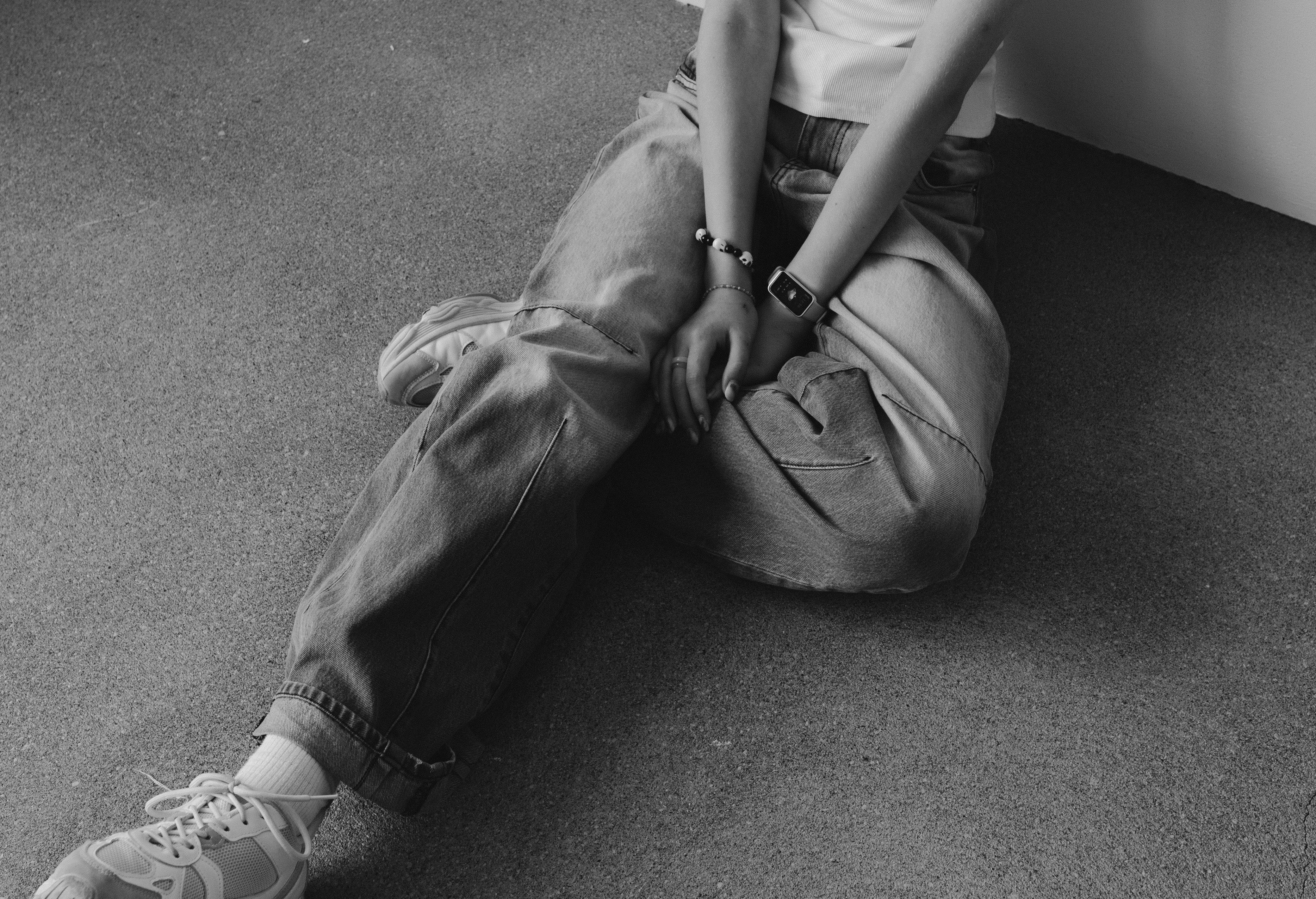 A woman sitting against a wall, wearing casual attire, smiling softly. Black and white photo. Photo Credit: Pexels @Alina Matveycheva