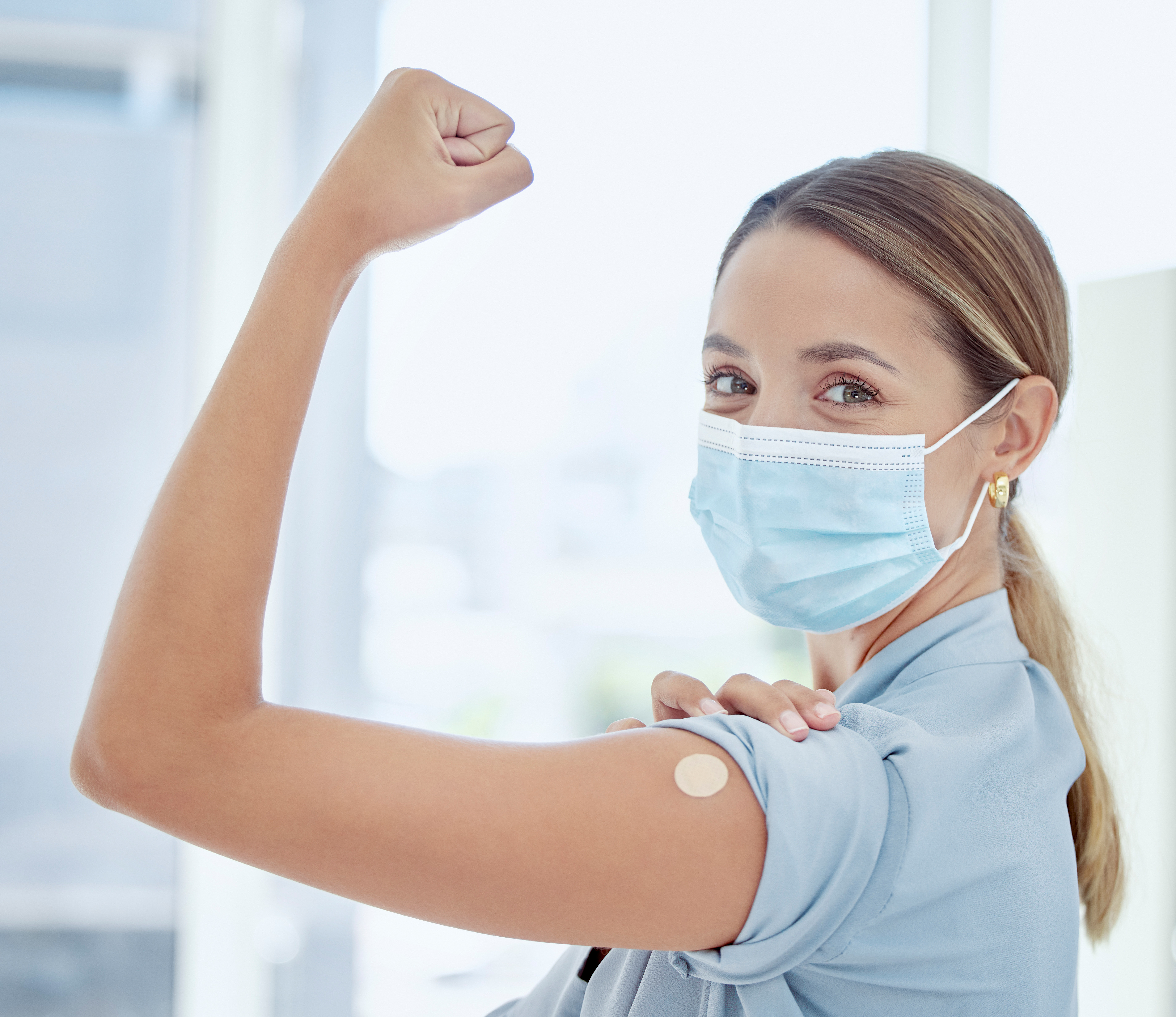 Woman, covid and vaccine injection success for safety, protection and medicine for strong immune sy. Photo Credit: Envato @YuriArcursPeopleimages