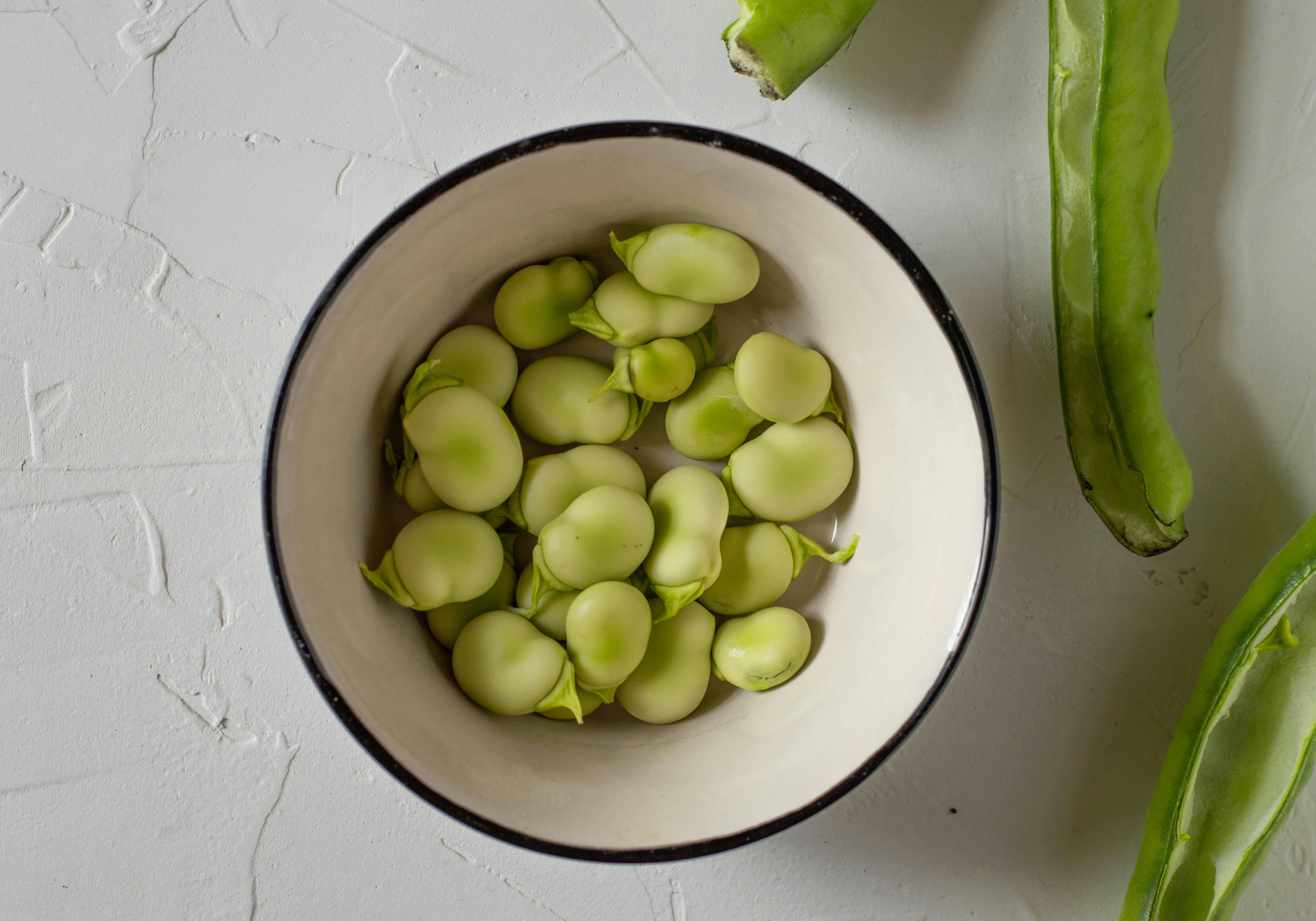 Overhead shot of fresh broad beans in a ceramic bowl, showing healthy green legumes. Photo Credit: Pexels @Ilaria M
