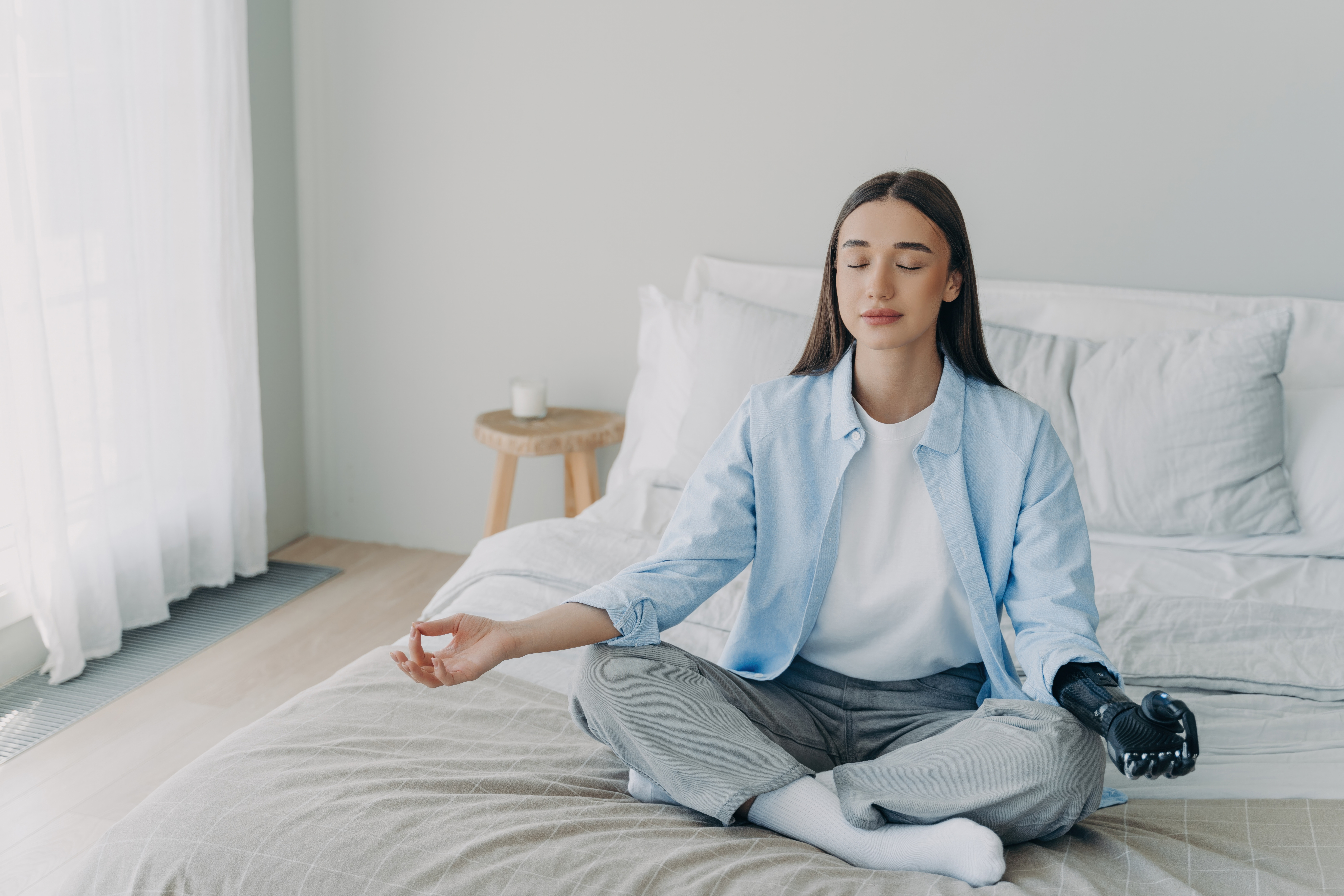 Serene young woman with a prosthetic hand meditating on the bed, embodying peace and resilience. Photo Credit: Envato @StudioVK