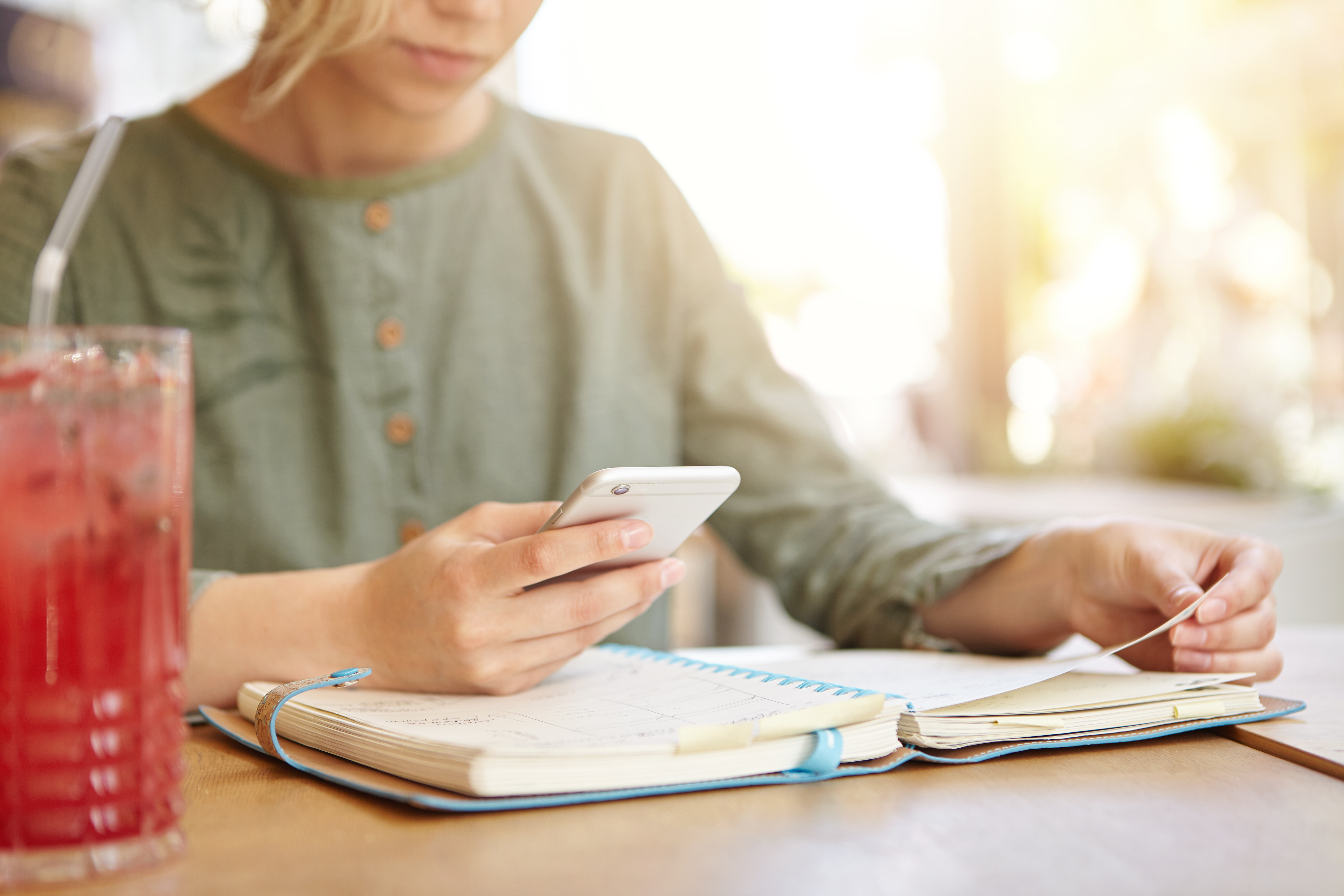 Cropped shot of young businesswoman sitting at cafe looking at her organiser and in calendar on smar. Photo Credit: Envato @wayhomestudioo