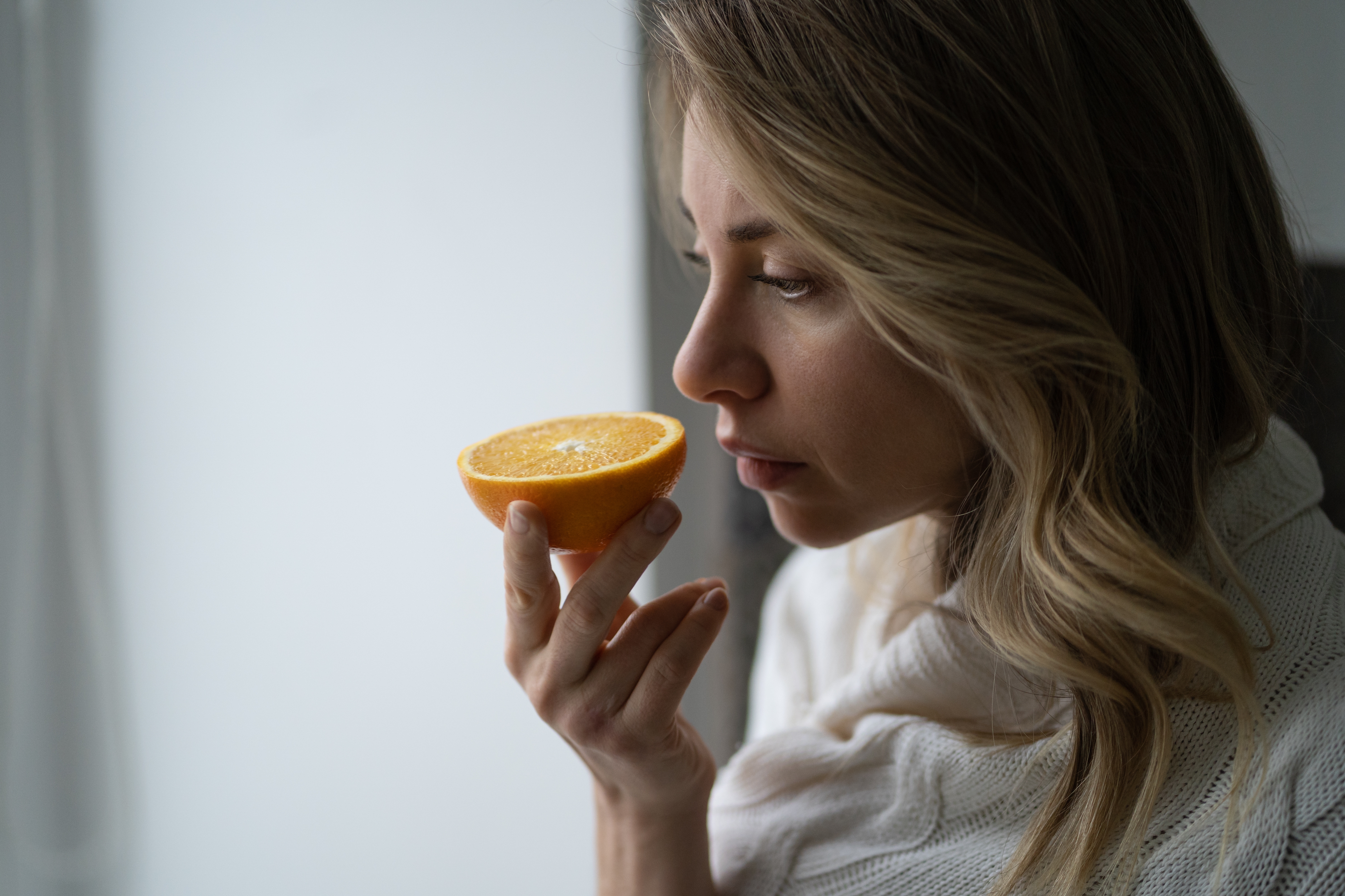 Woman trying to sense smell of half fresh orange, has symptoms of Covid-19 loss of smell and taste. Photo Credit: Envato @Dimaberlin