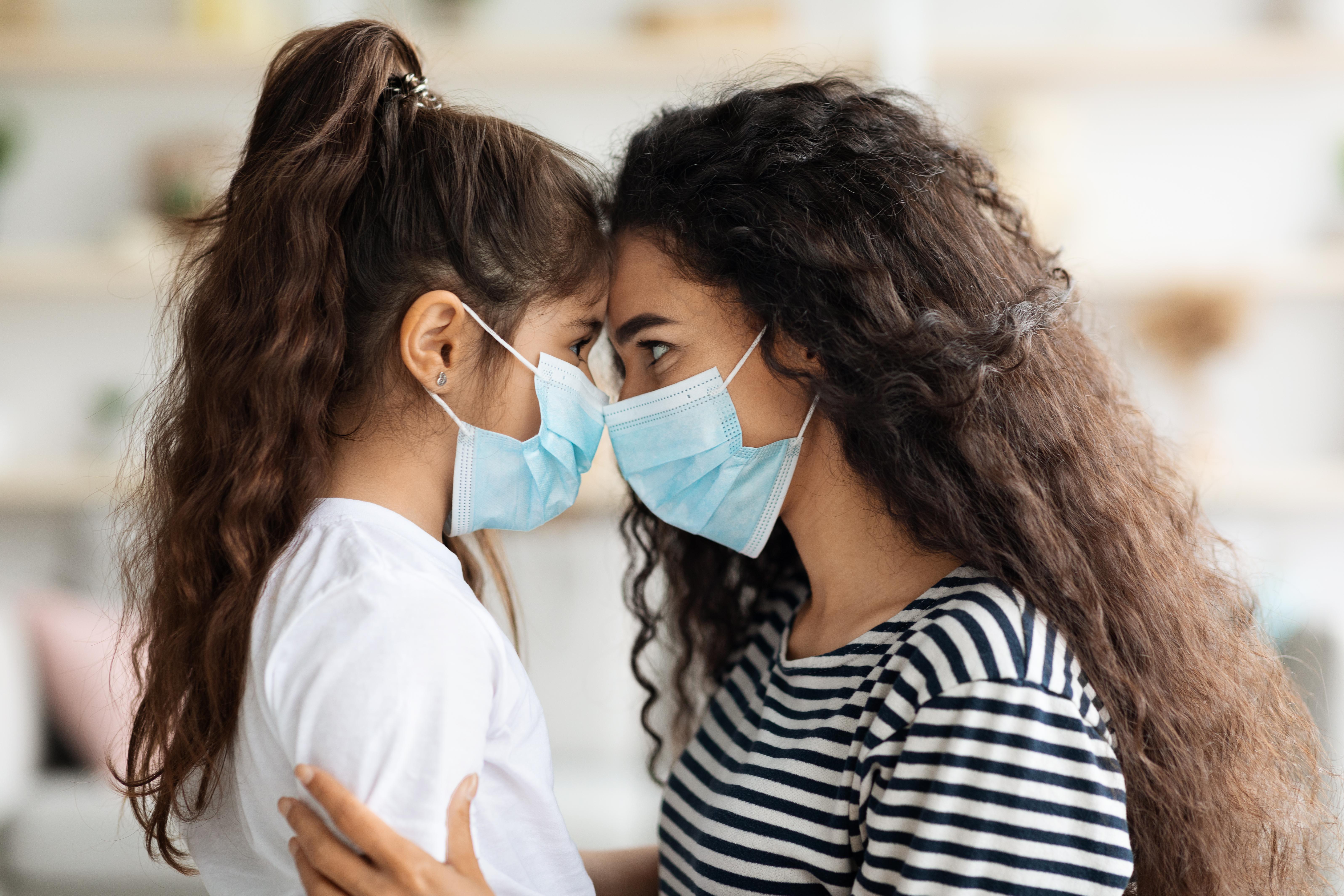 Side view of woman and kid wearing face masks, closeup. Photo Credit: Envato @Prostock-studio