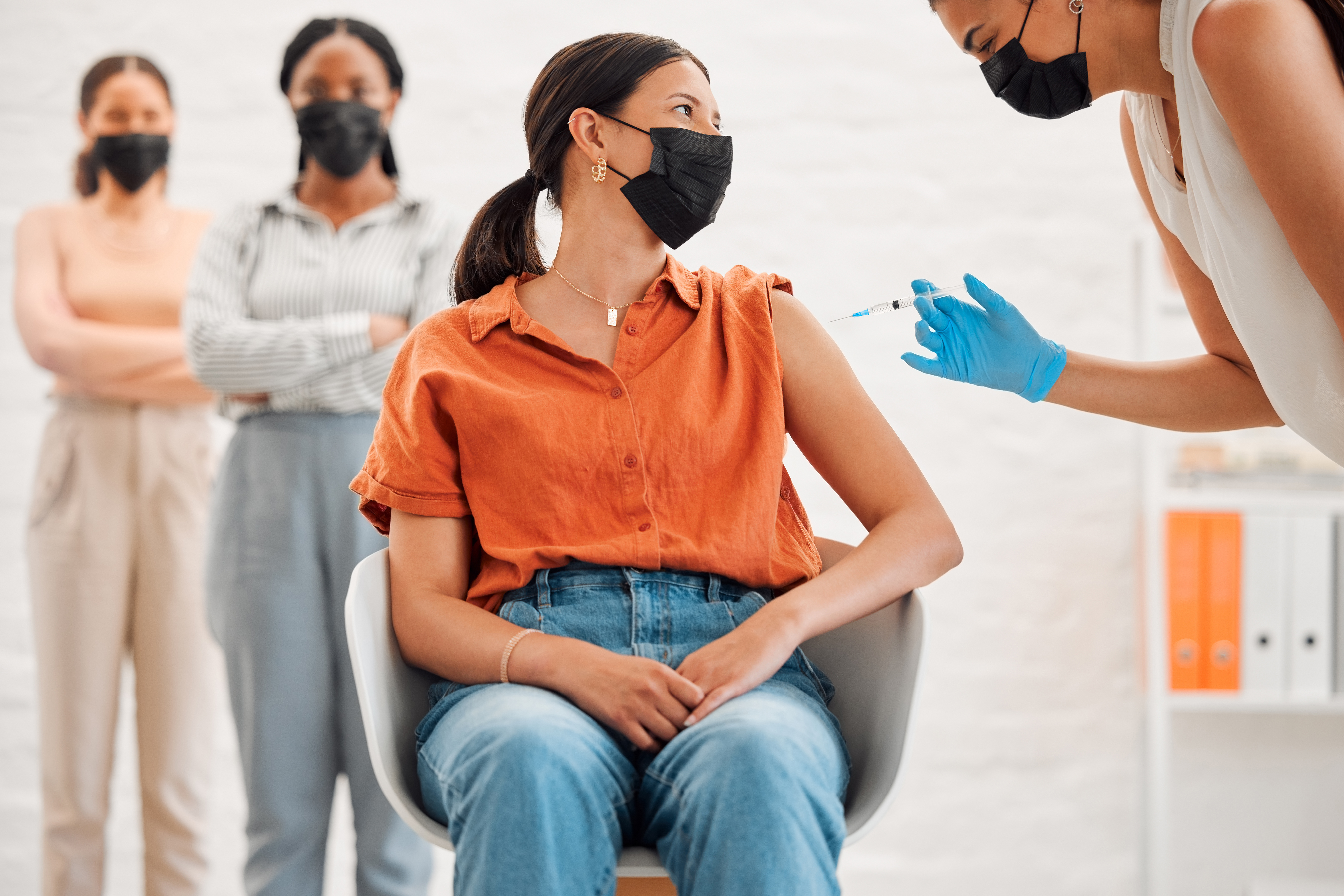 Vaccine, virus and vaccination line at clinic for Covid needle shot. Public health and serious illn. Photo Credit: Envato @YuriArcursPeopleimages