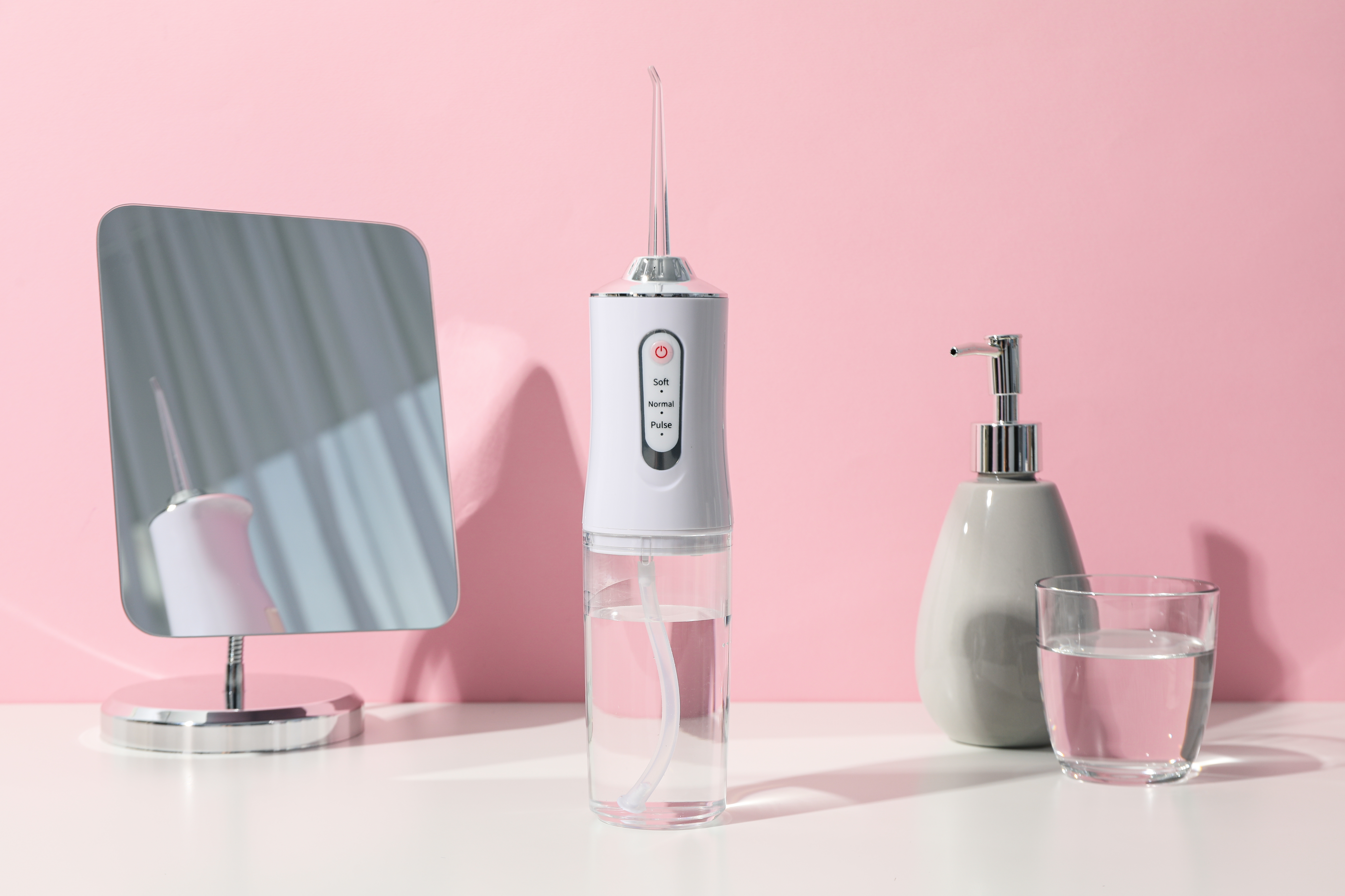 Irrigator, mirror and glass of water on table on pink background. Photo Credit: Envato @AtlasComposer