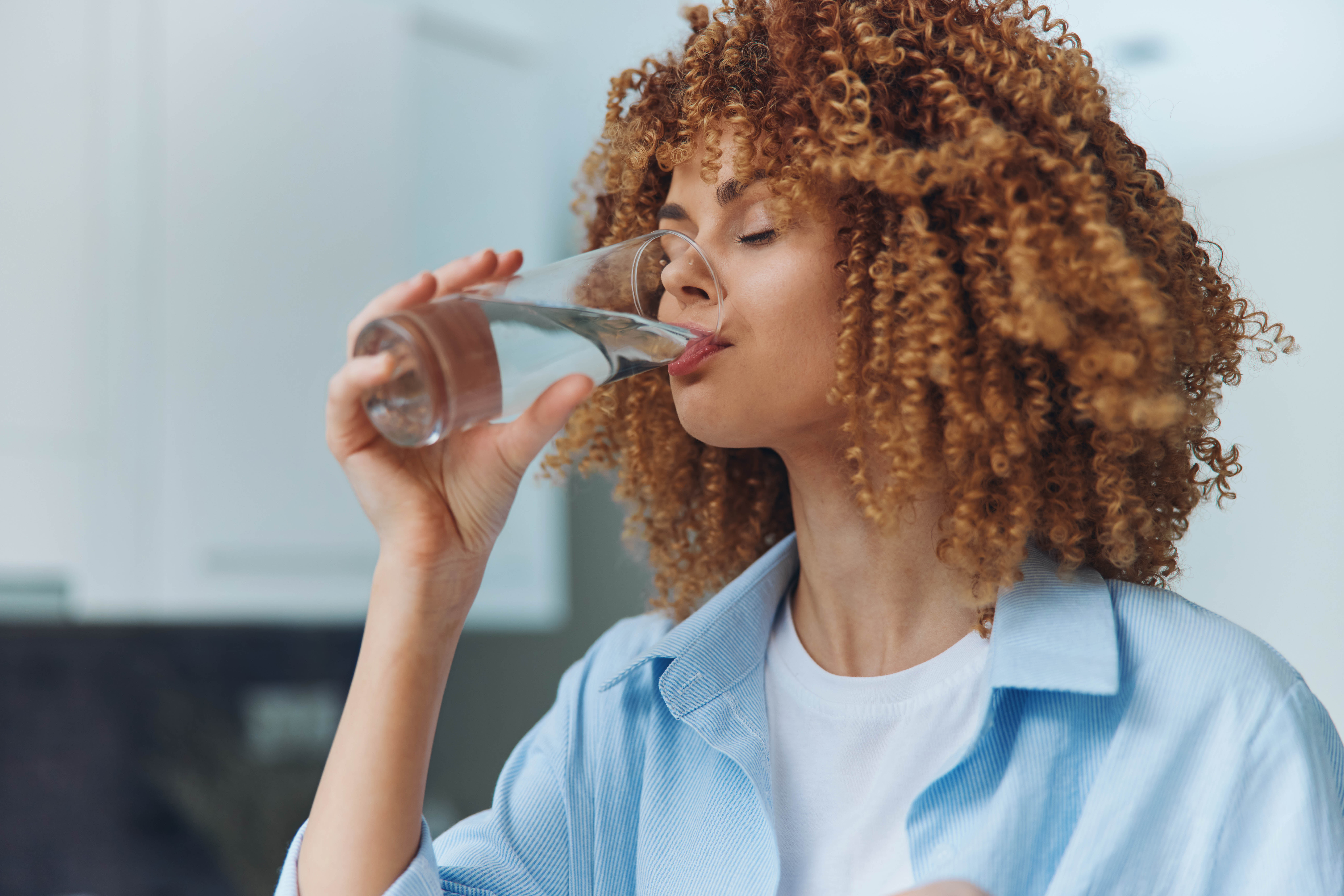 Young woman with curly hair enjoying a refreshing drink of water in her home kitchen, healthy. Photo Credit: Envato @shotprime