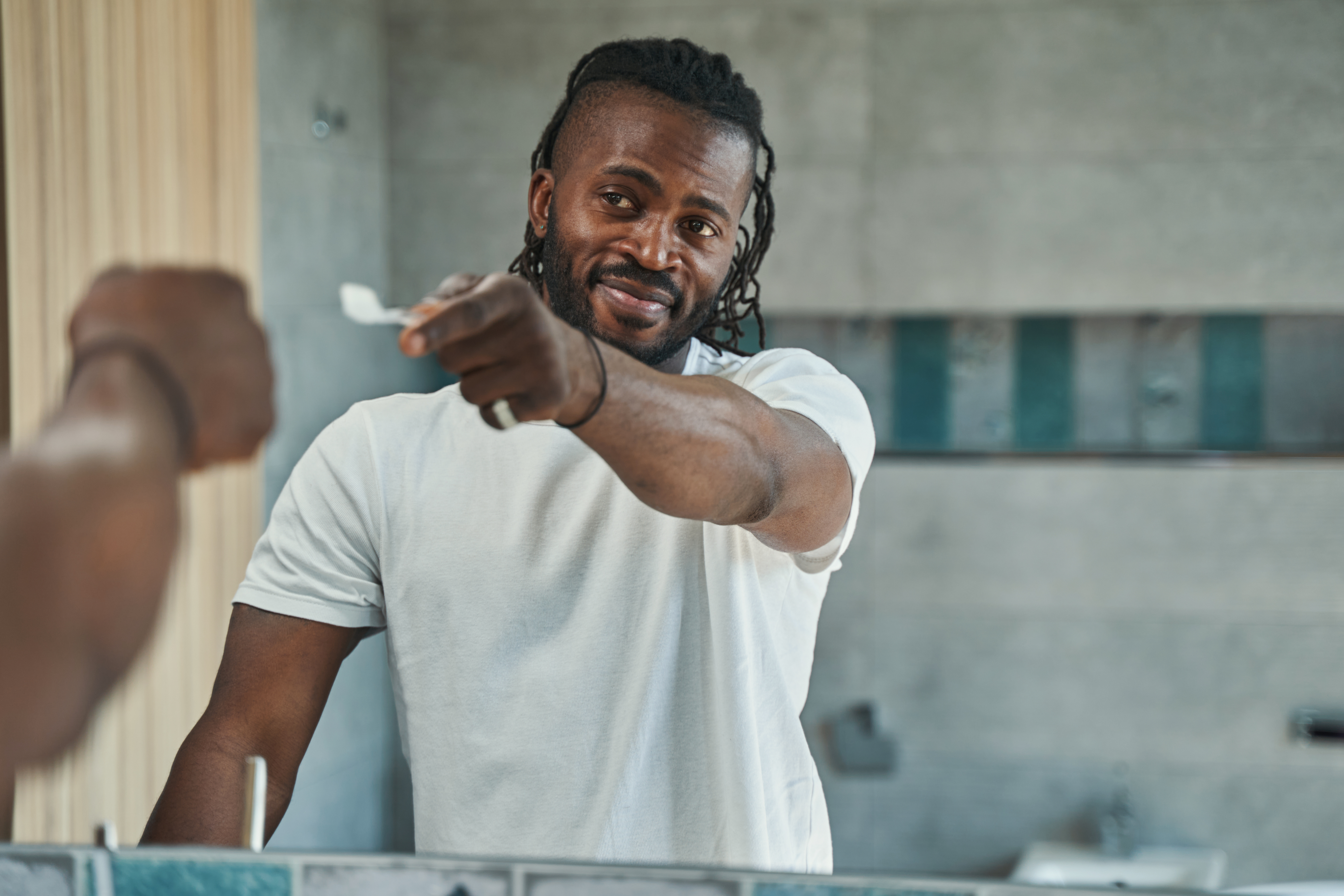 Guy with oral hygiene tool standing in bathroom. Photo Credit: Envato @Iakobchuk