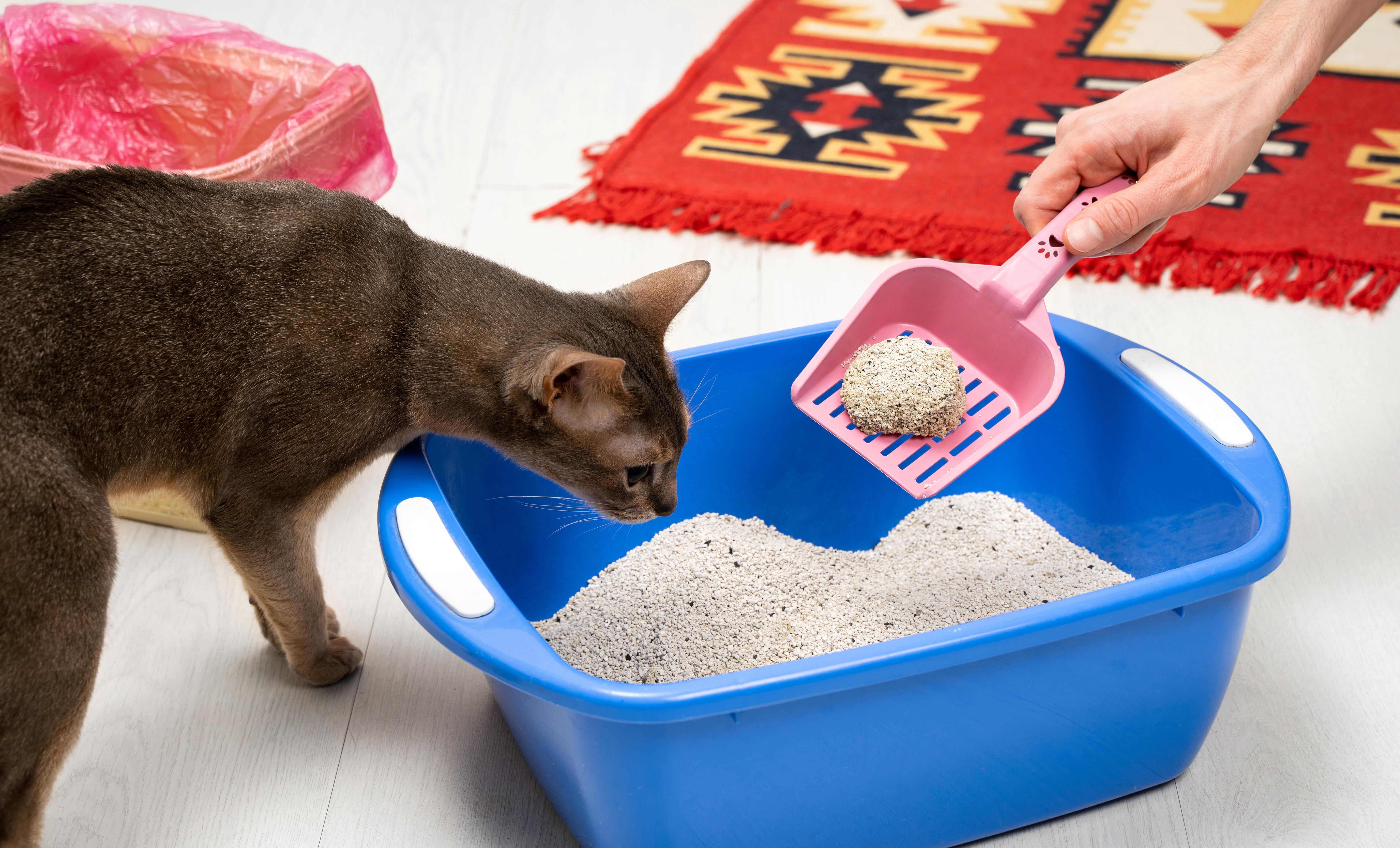 Man cleaning cat litter tray at home, closeup. Cute blue Abyssinian cat watching the process. Photo Credit: Envato @Garnar