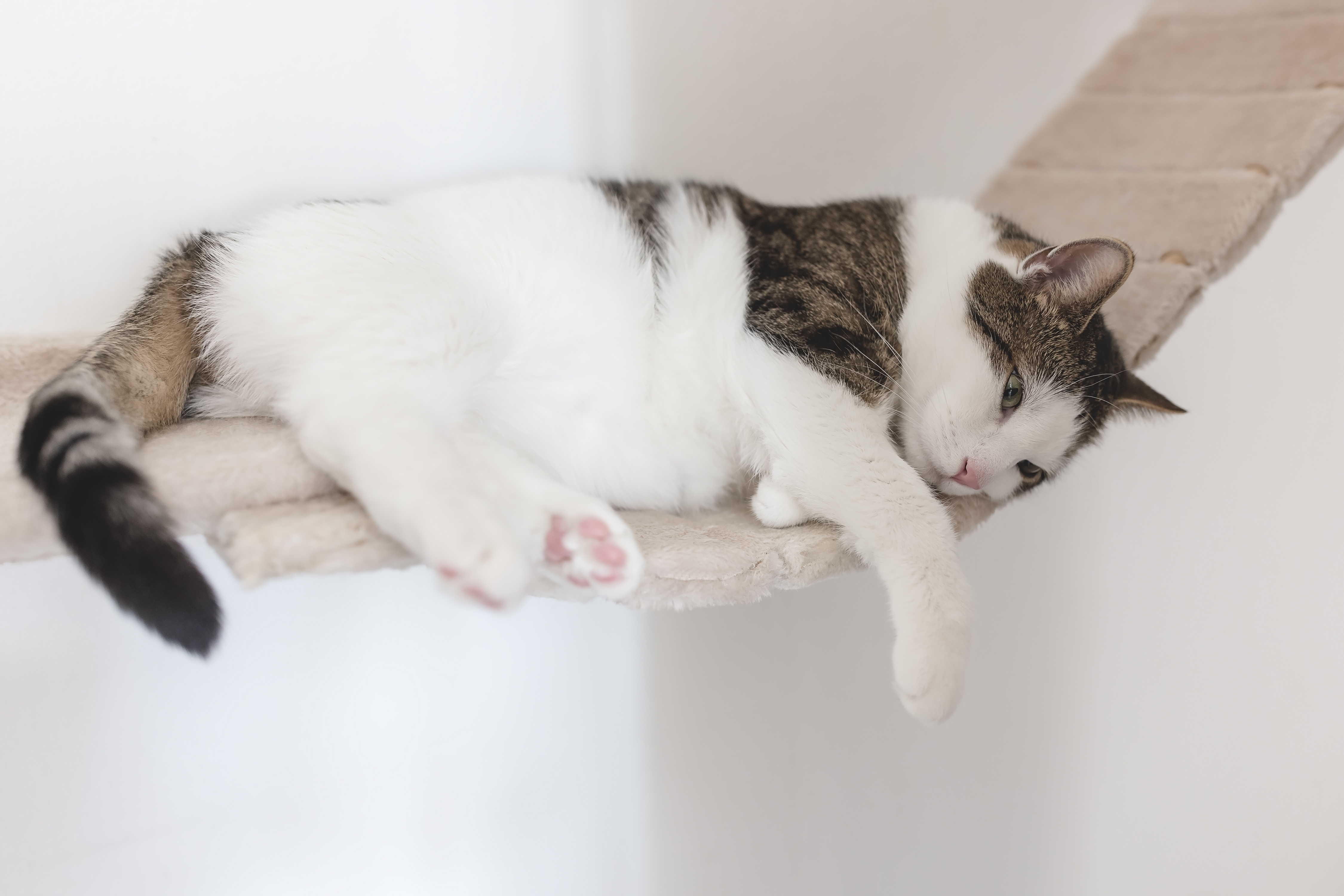 Tired sad domestic cat laying on hanging rope bridge for cats. Cat health and behavior. Photo Credit: Envato @lermont51