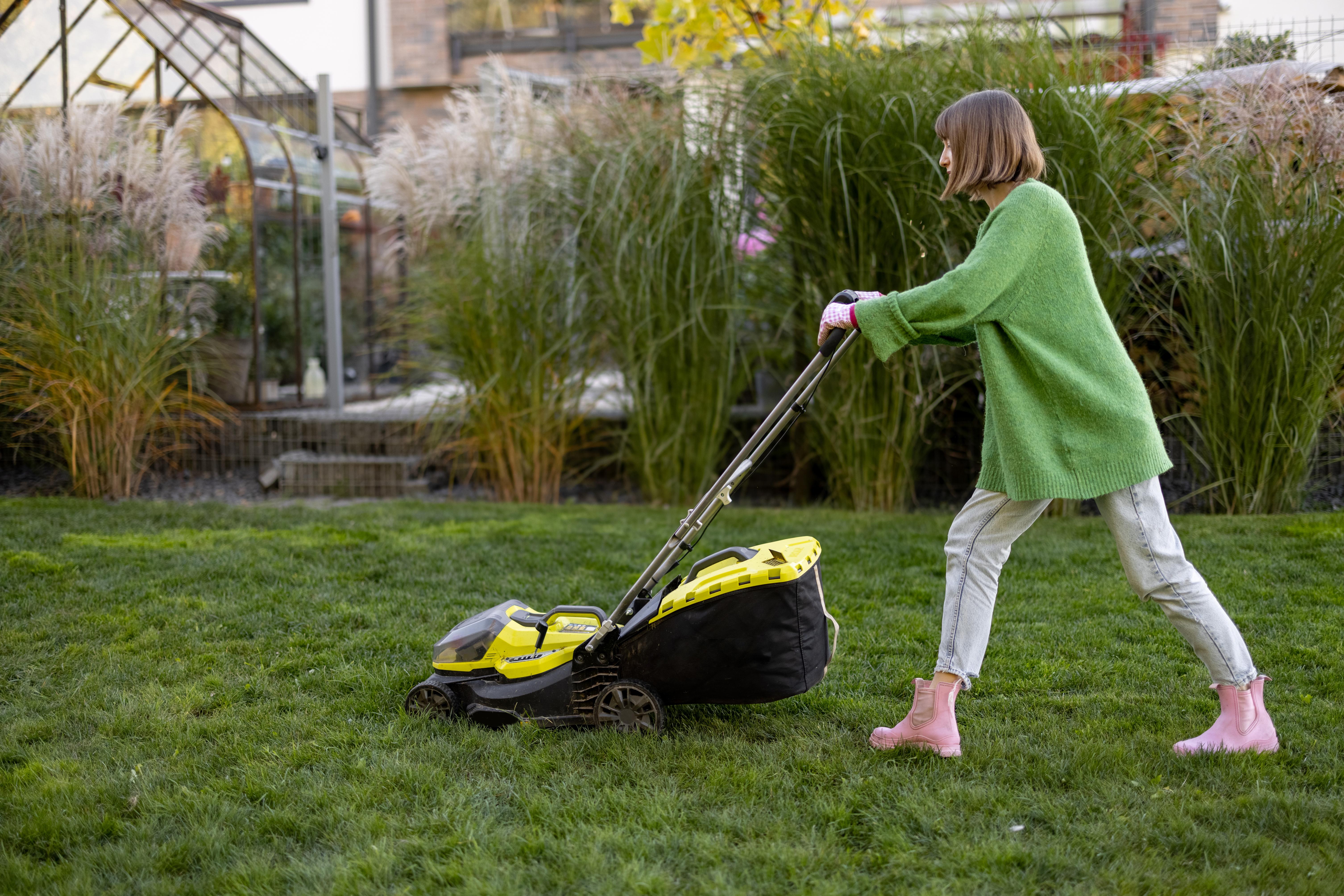 Woman cuts grass with electric lawn mower on backyard. Photo Credit: Envato @RossHelen