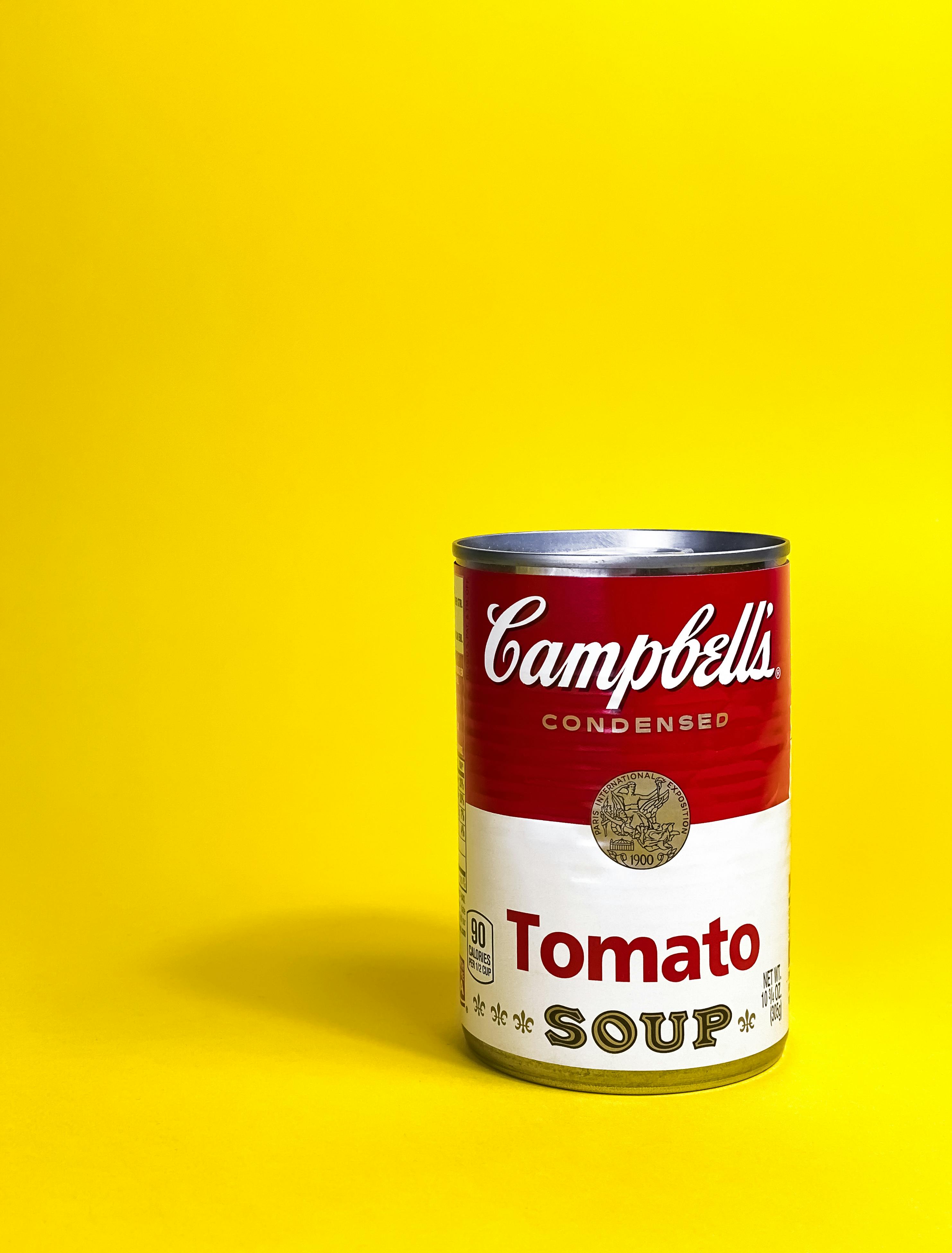 Classic Campbell's Tomato Soup can against a bright yellow background, perfect for pop art themes. Photo Credit: Pexels @Anastasiya Badun