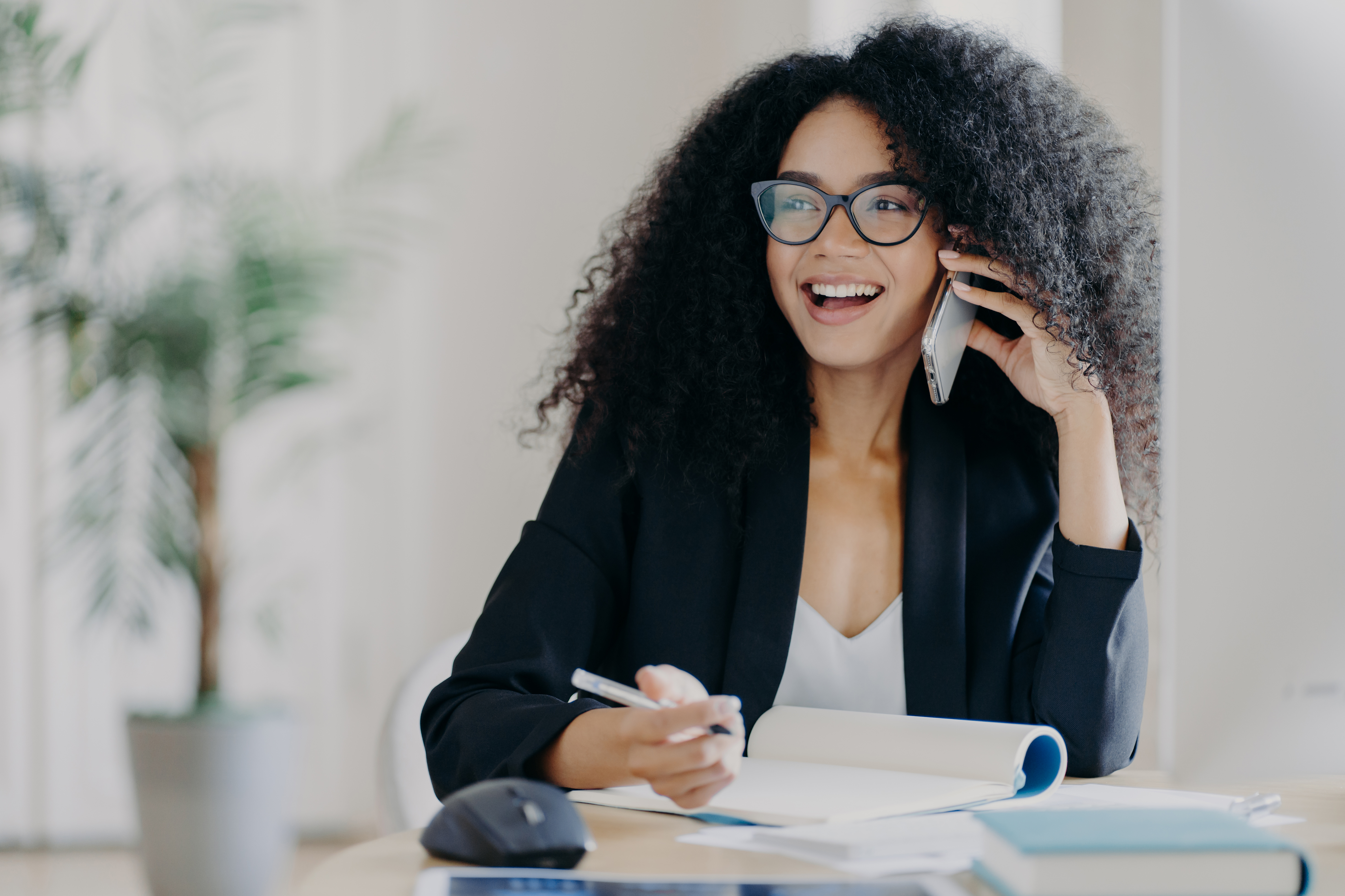 Photo of glad smiling dark skinned woman calls business partner, being in good mood. Photo Credit: Envato @StudioVK