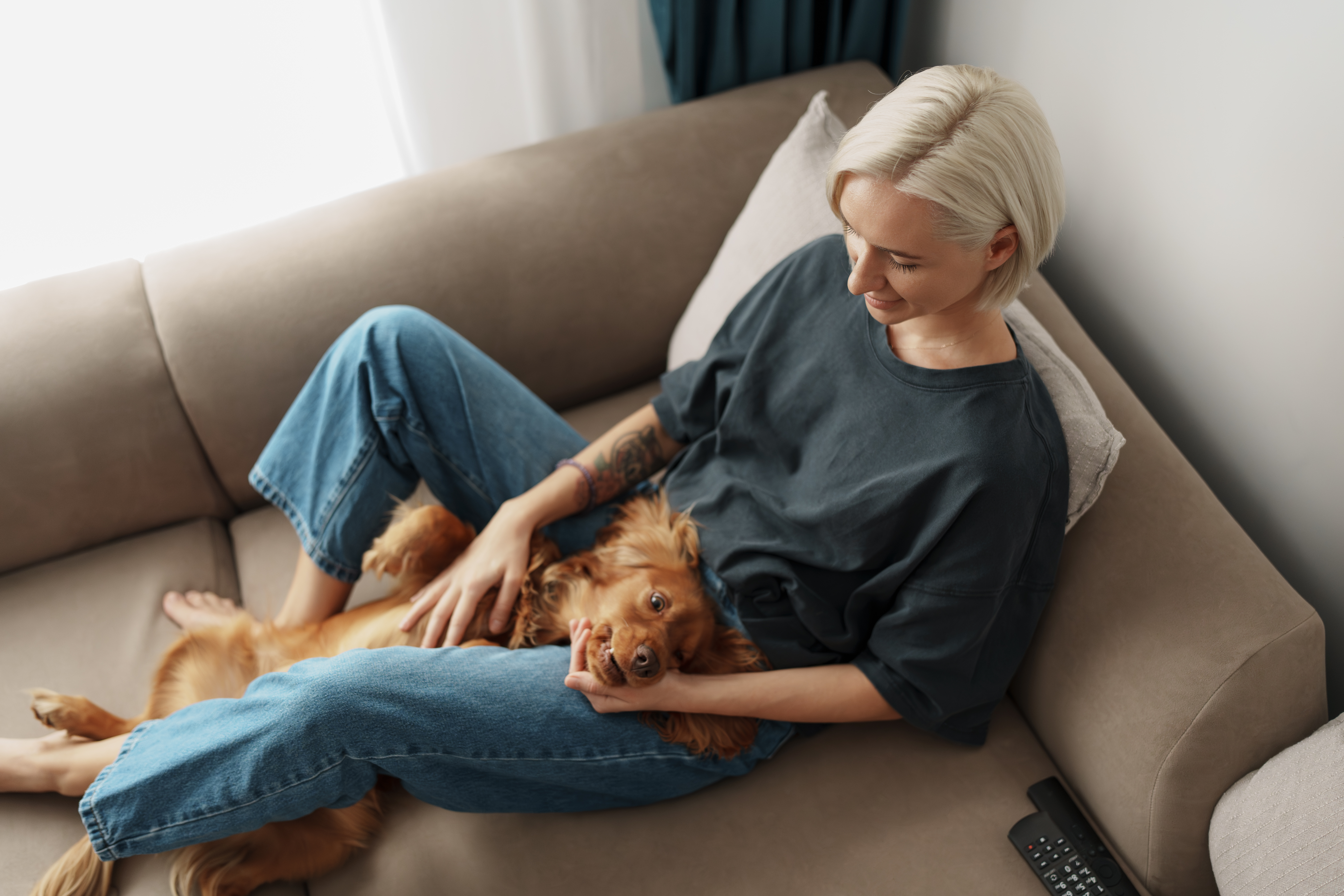 Woman relaxing on a sofa with her beloved dog at home. Photo Credit: Envato @arthurhidden
