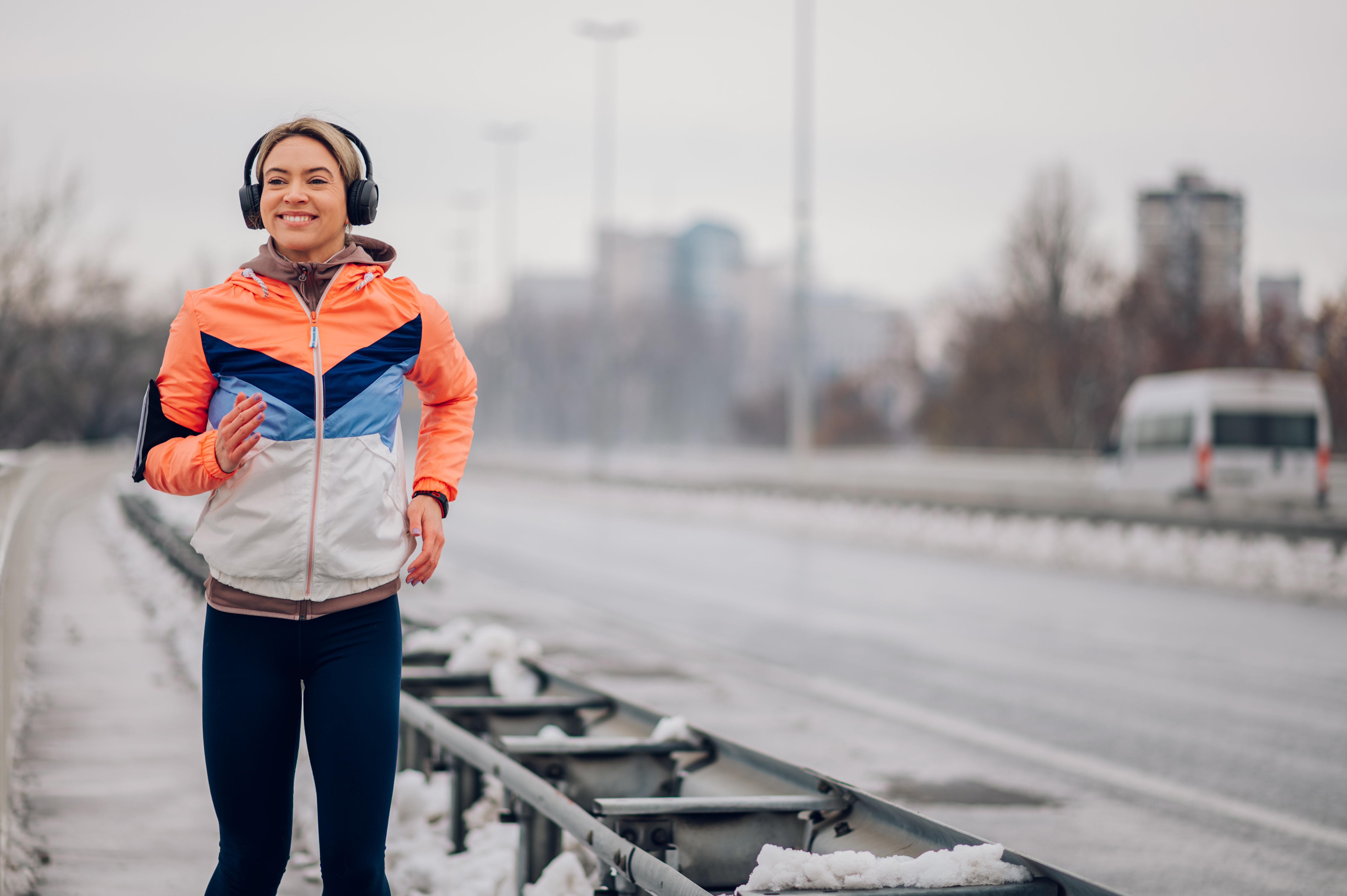 Woman running on the bridge at winter and snow. Photo Credit: Envato @zamrznutitonovi