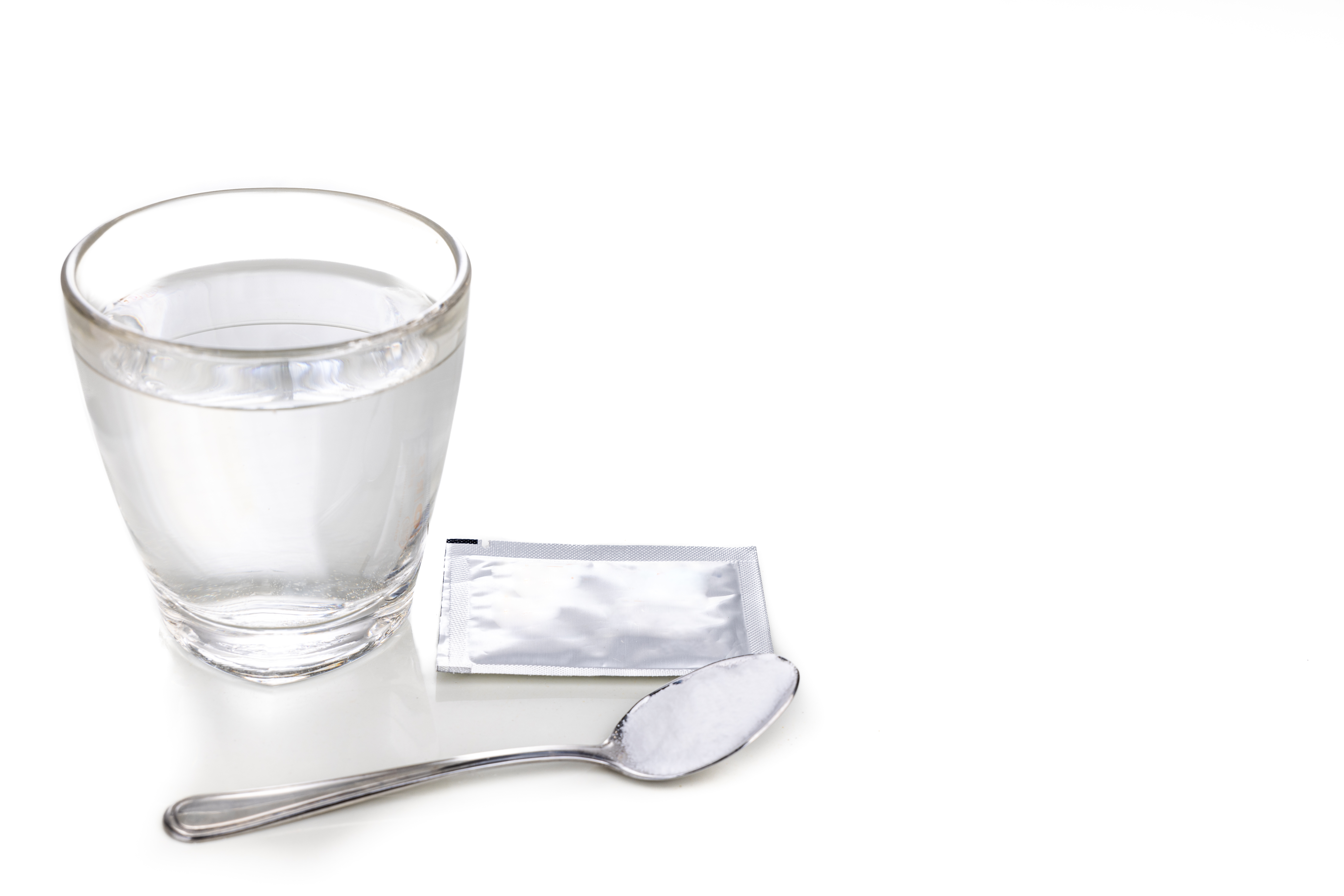 ORS or oral rehydration salt with glass of water, sachet and spoon. Photo Credit: Envato @ThamKC
