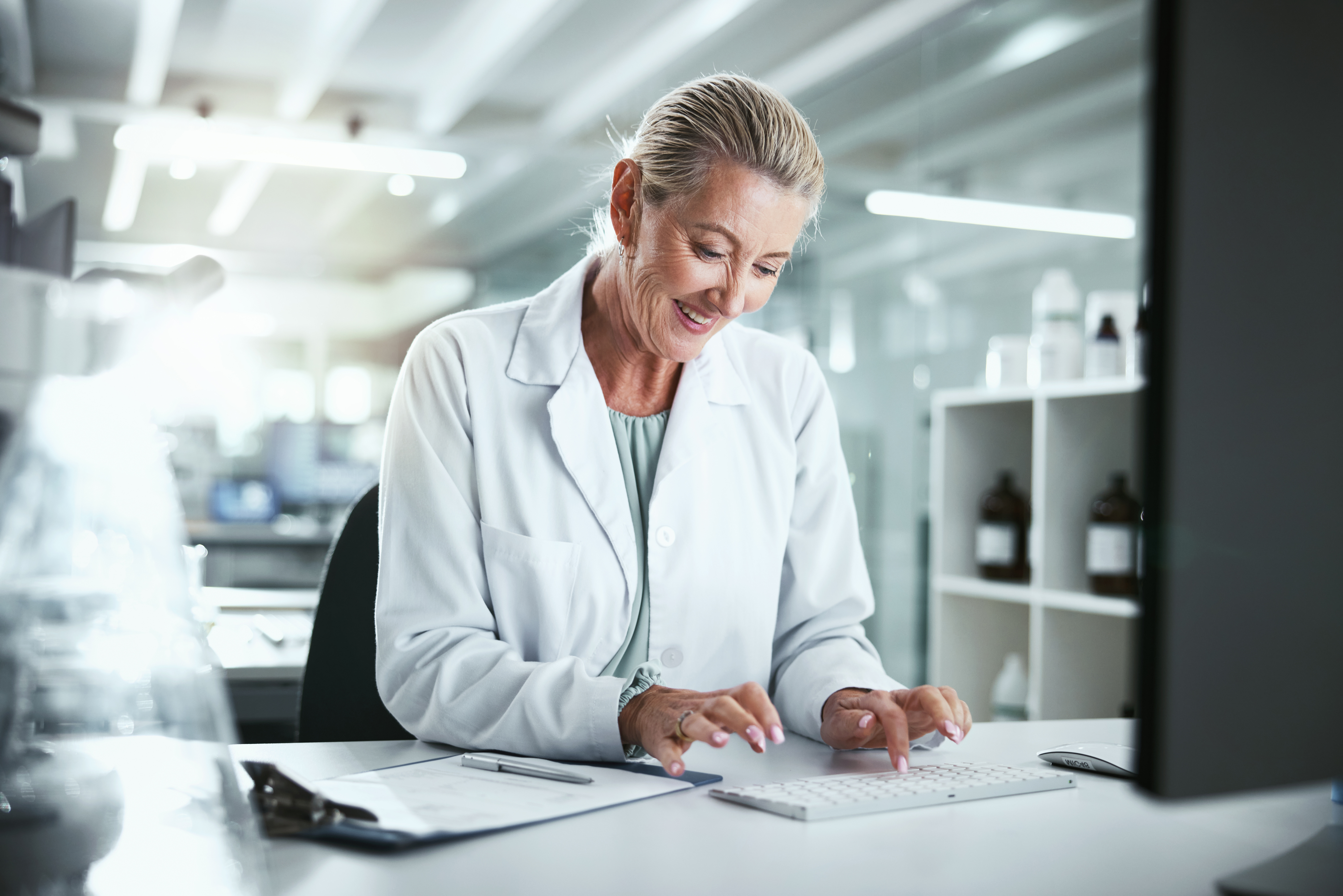 Keyboard, woman and scientist typing in laboratory for medical research on cancer drug trial. Smile. Photo Credit: Envato @YuriArcursPeopleimages