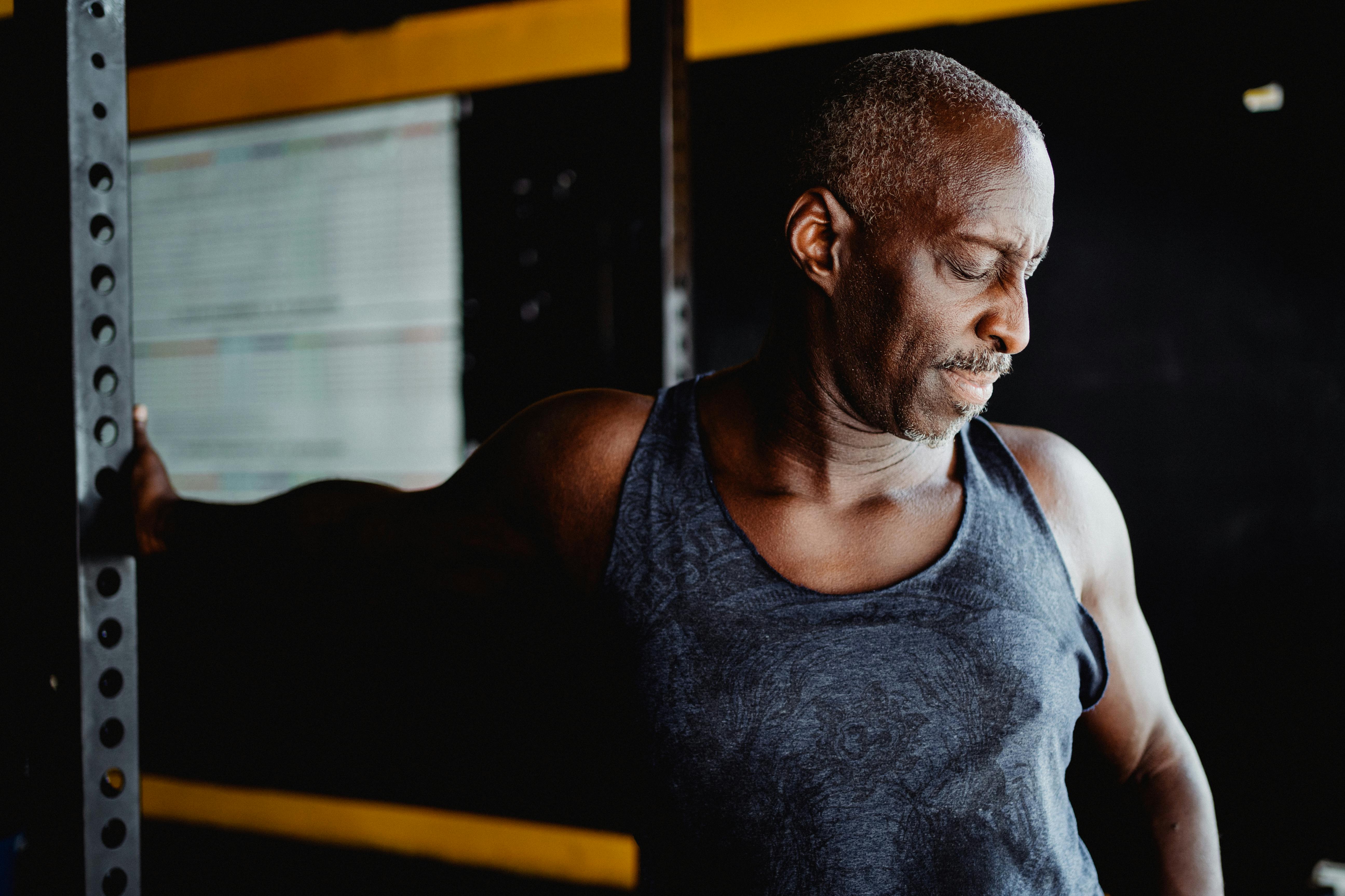 A senior man in active wear stretching in a gym, promoting fitness and well-being. Photo Credit: Pexels @Ketut Subiyanto