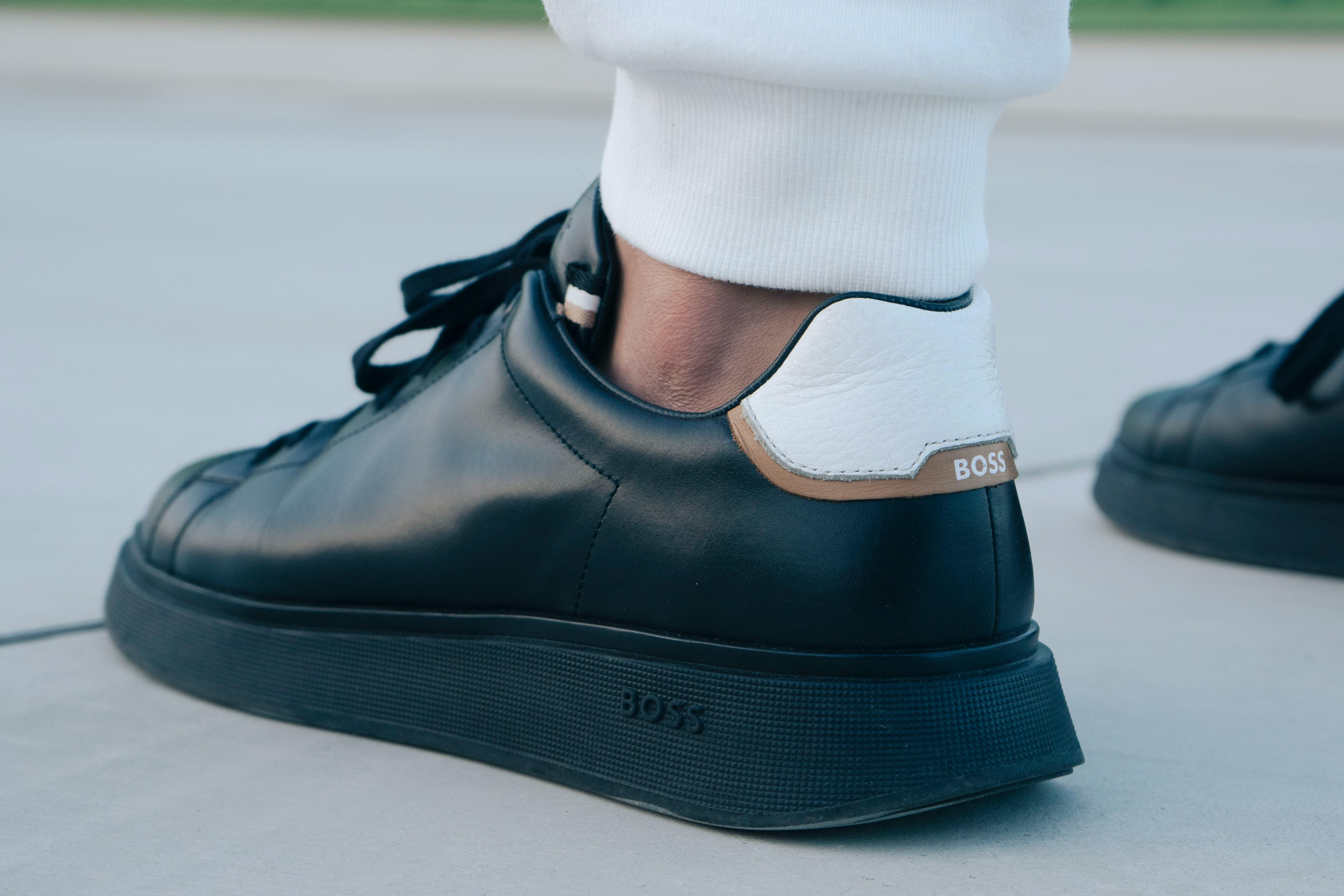 Detail shot of black and white sneakers worn outdoors, showcasing modern fashion. Photo Credit: Pexels @Hamdi Hamad
