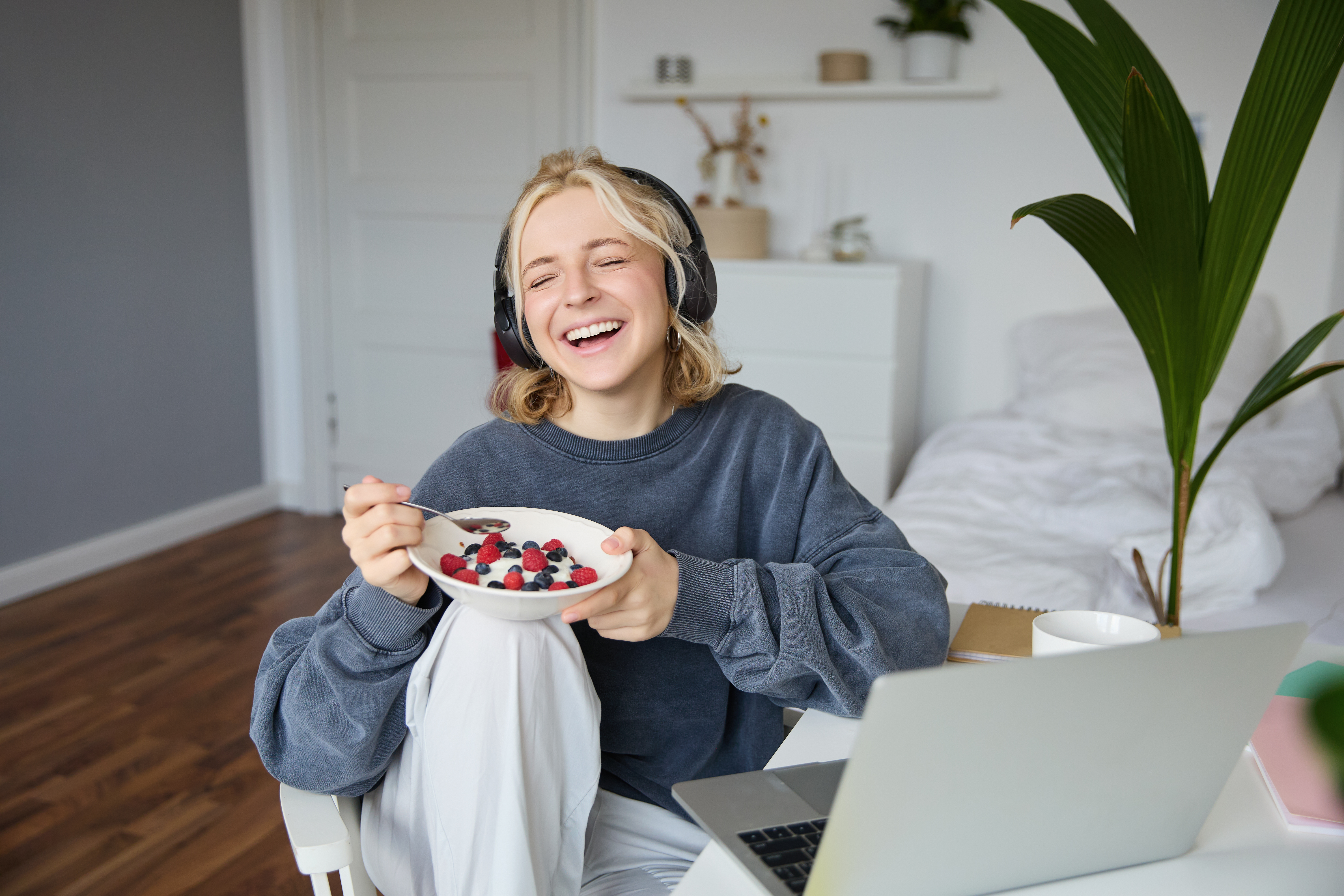 Portrait of happy young blond woman, sitting in a room, watching movie on laptop and eating healthy. Photo Credit: Envato @benzoix