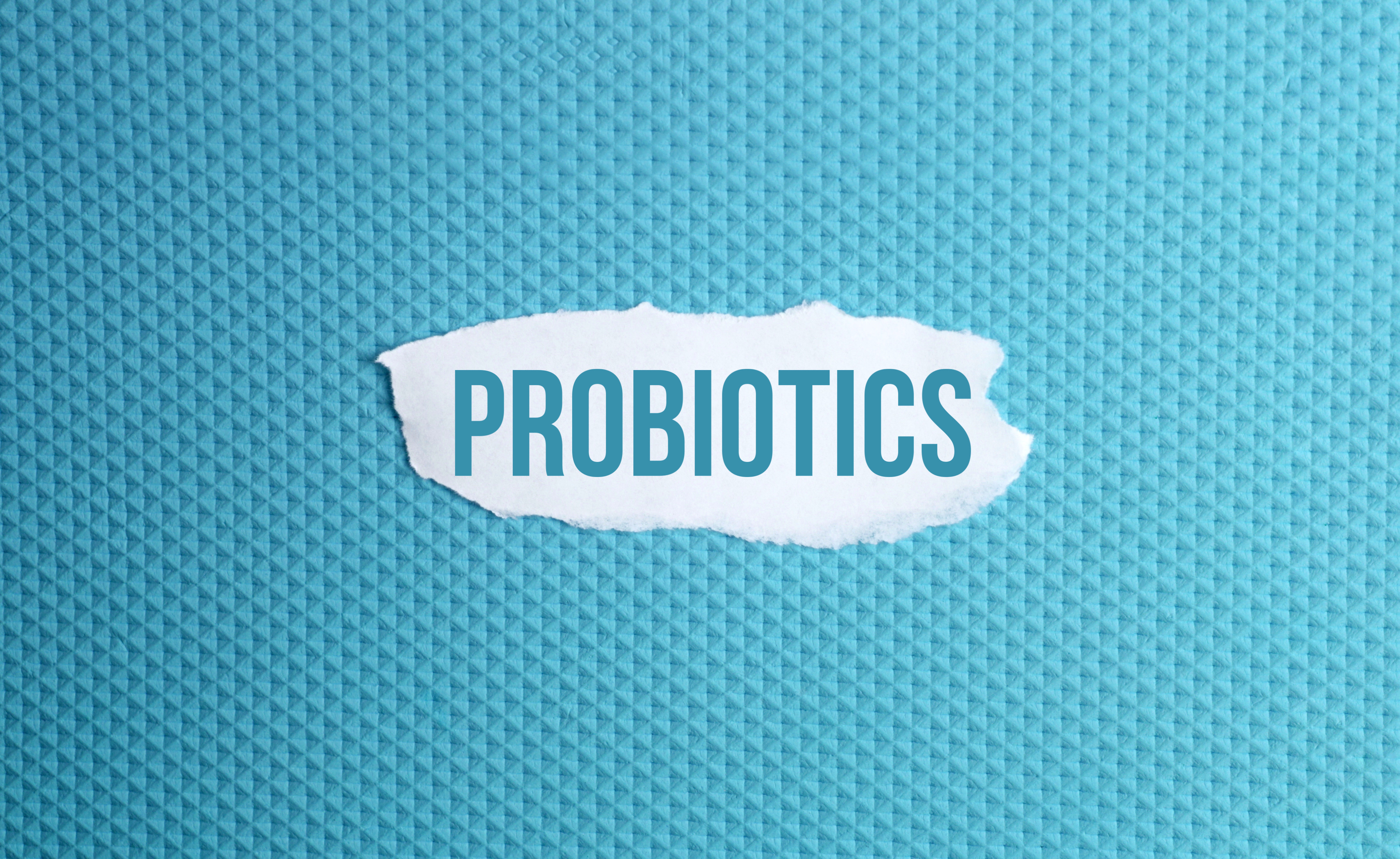 a torn paper written with inscription probiotics on a blue background. Photo Credit: Envato @margaritaylita
