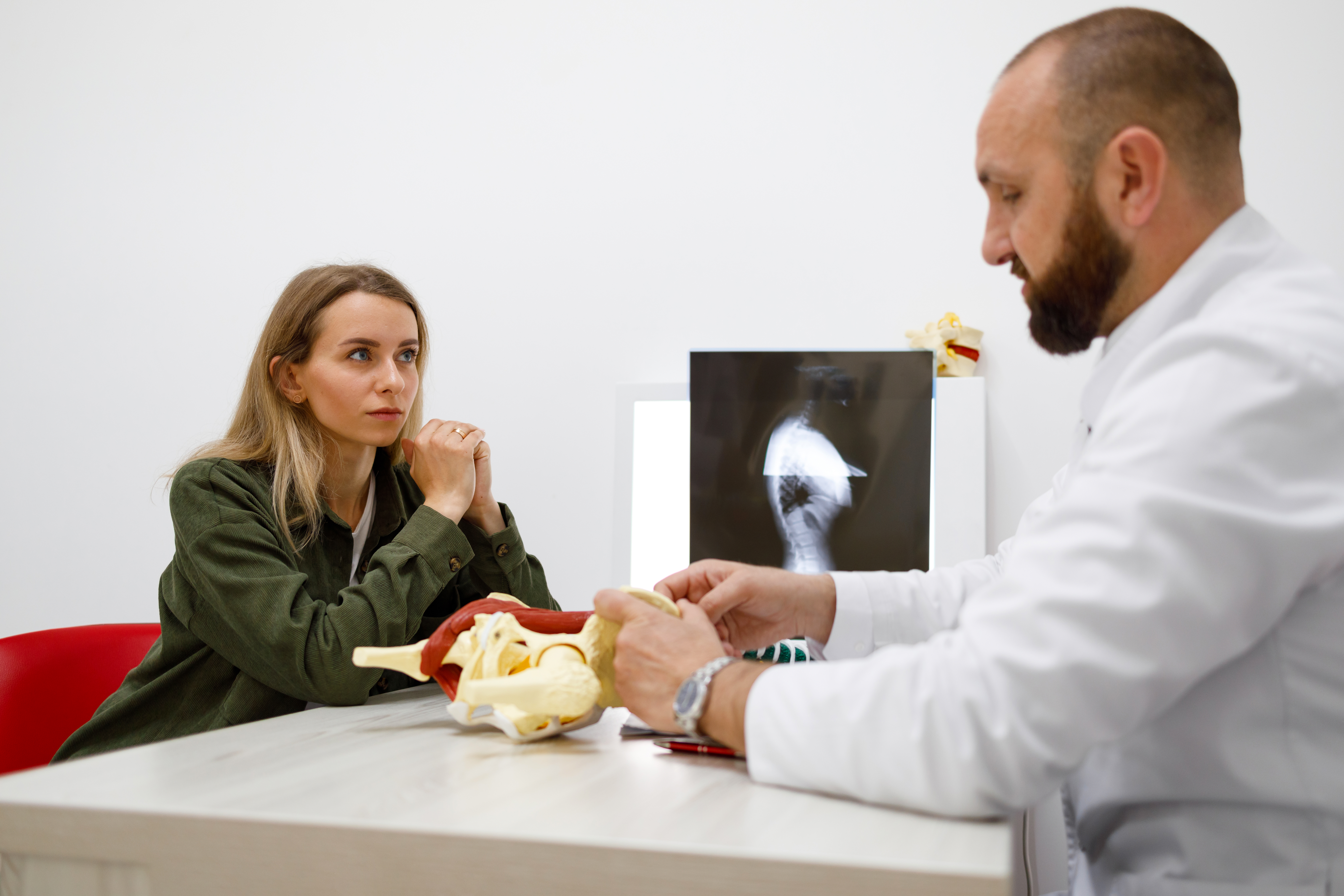 Orthopedic doctor talk with patient about problems with the spine on the example of a model. Photo Credit: Envato @borodai