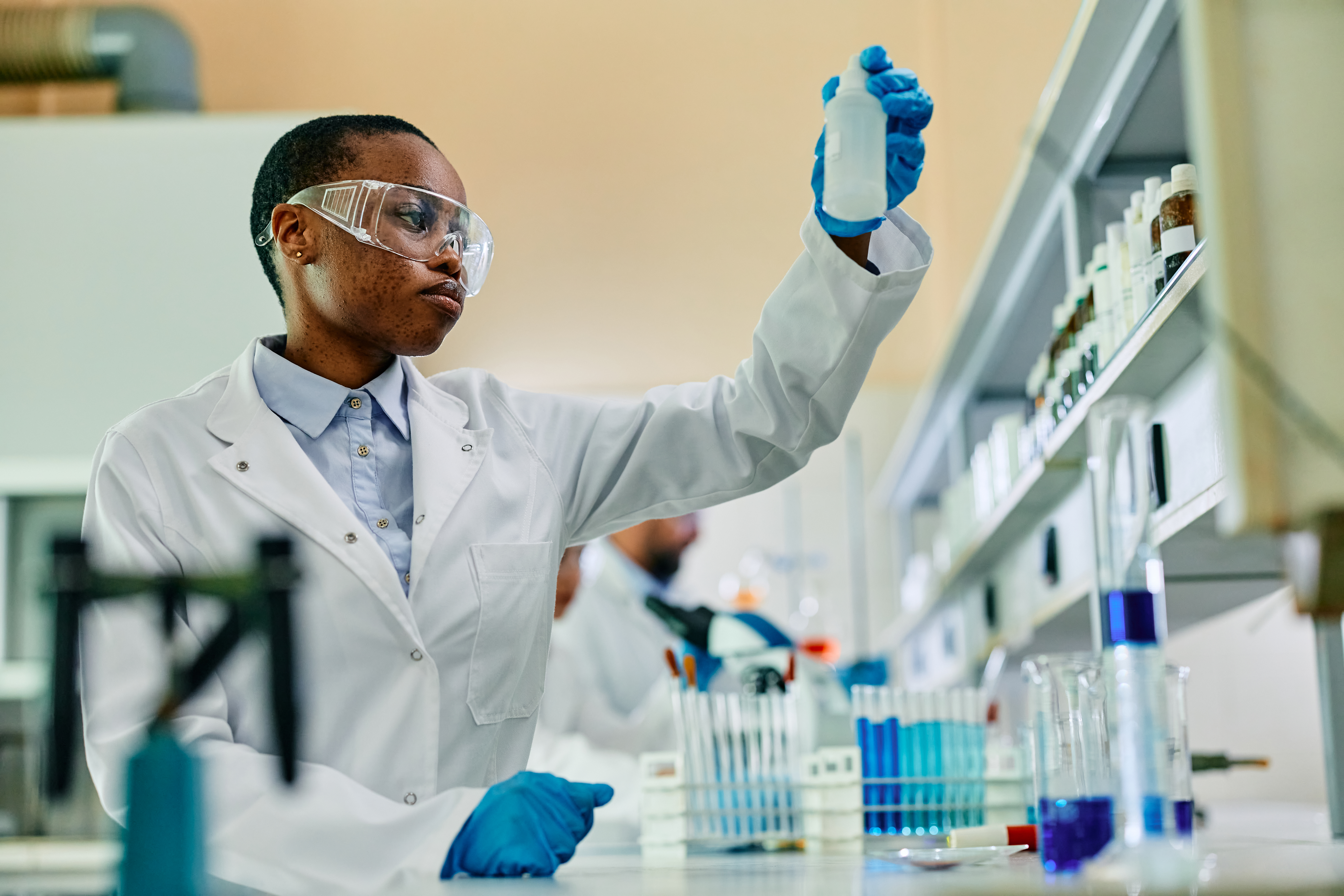 African American female chemist during scientific research in a lab. Photo Credit: Envato @drazenphoto
