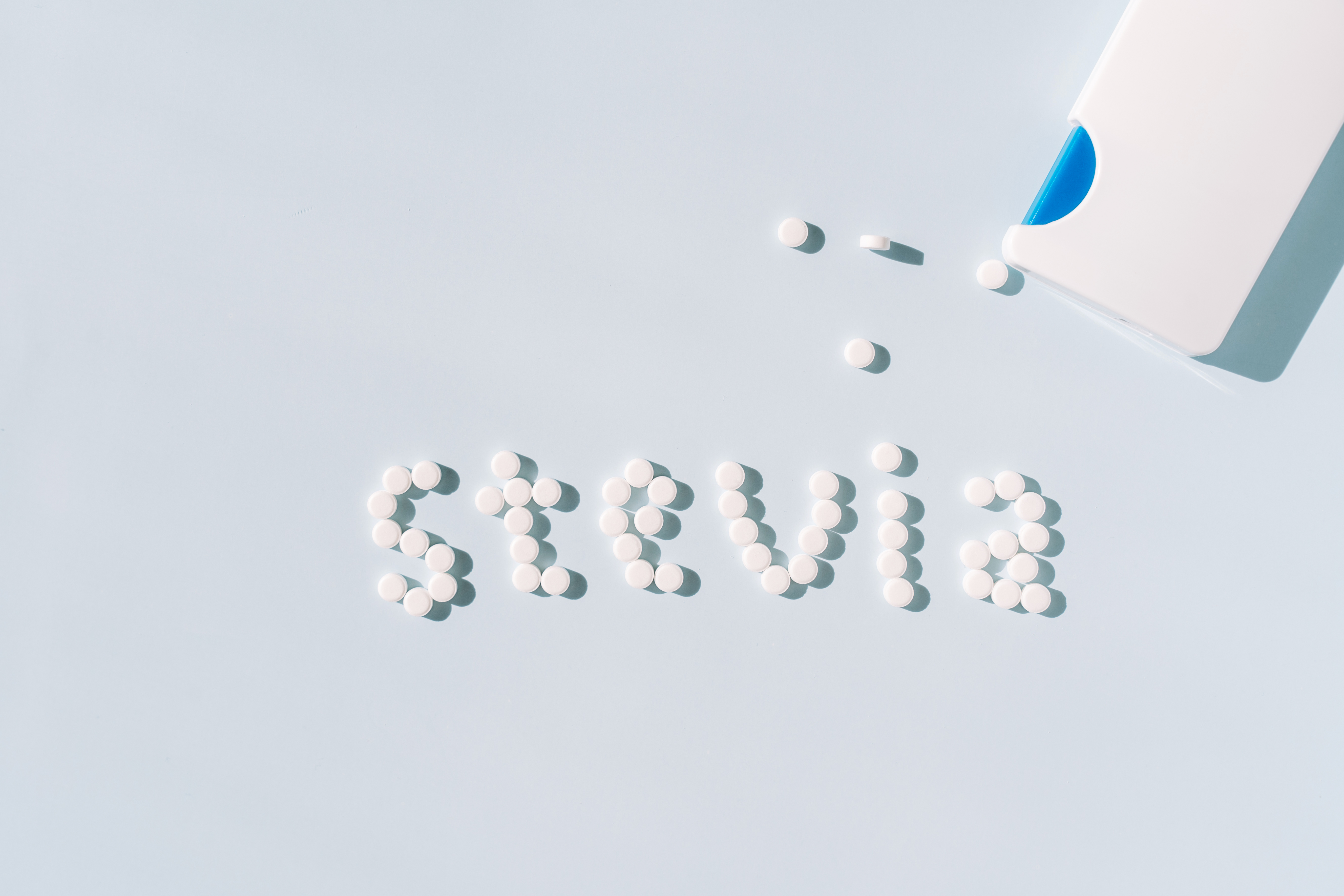 The word stevia from sweetener in tablets over a blue background. Photo Credit: Envato @Nestea06