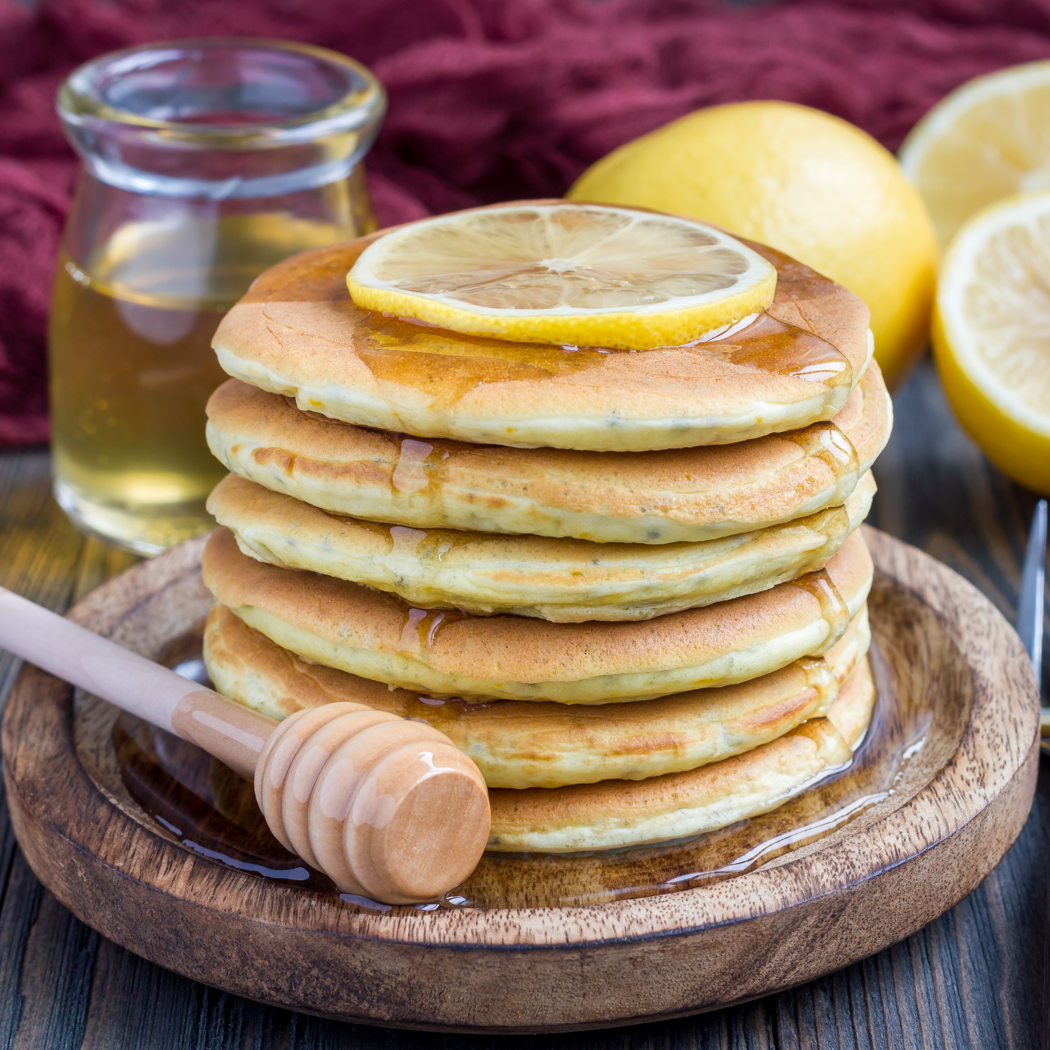 Lemon and chia seed pancakes served with honey, square. Photo Credit: Envato @iuliia_n