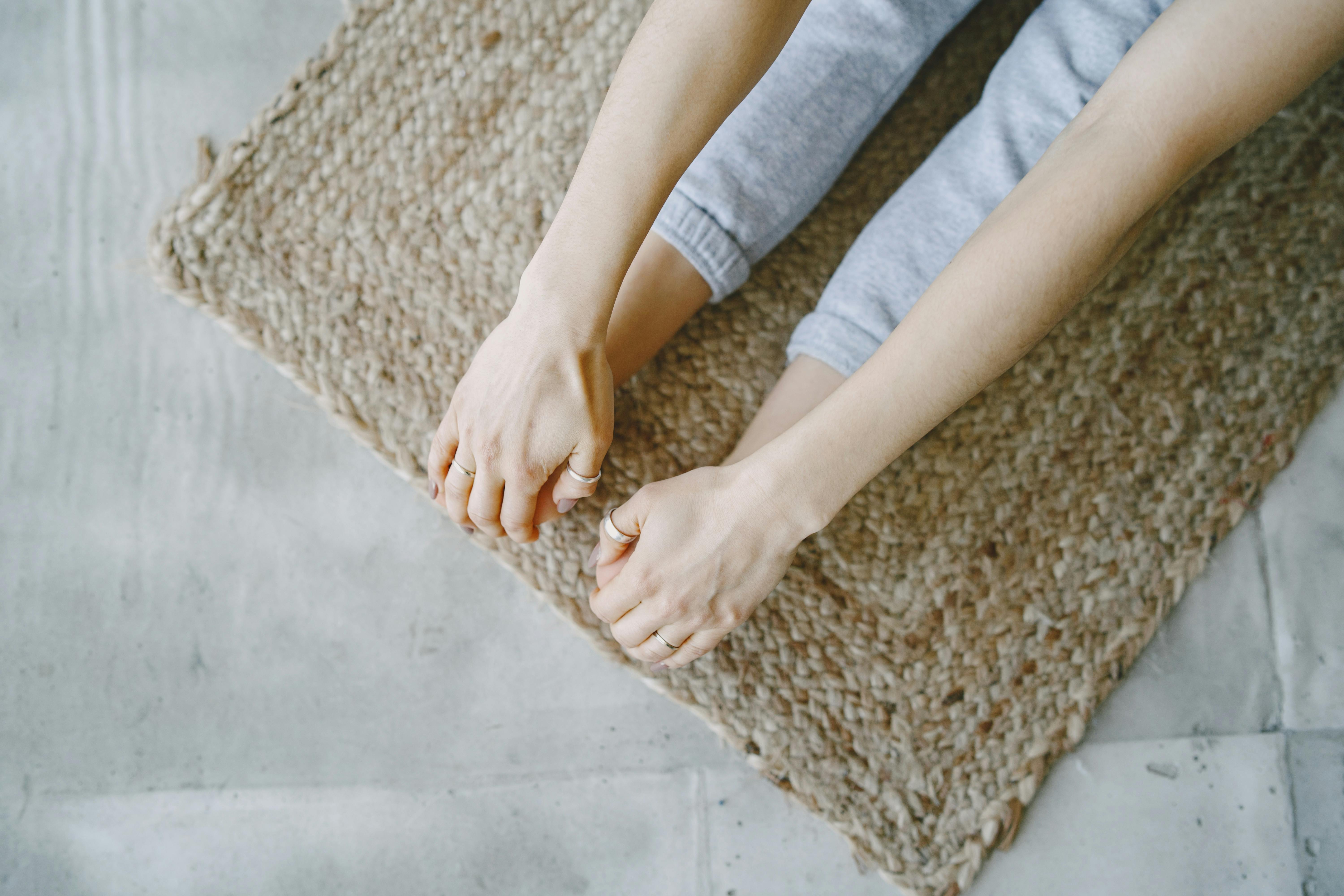 A person stretching on a woven mat. Close-up view of hands and feet in relaxed yoga pose. Photo Credit: Pexels @Gustavo Fring