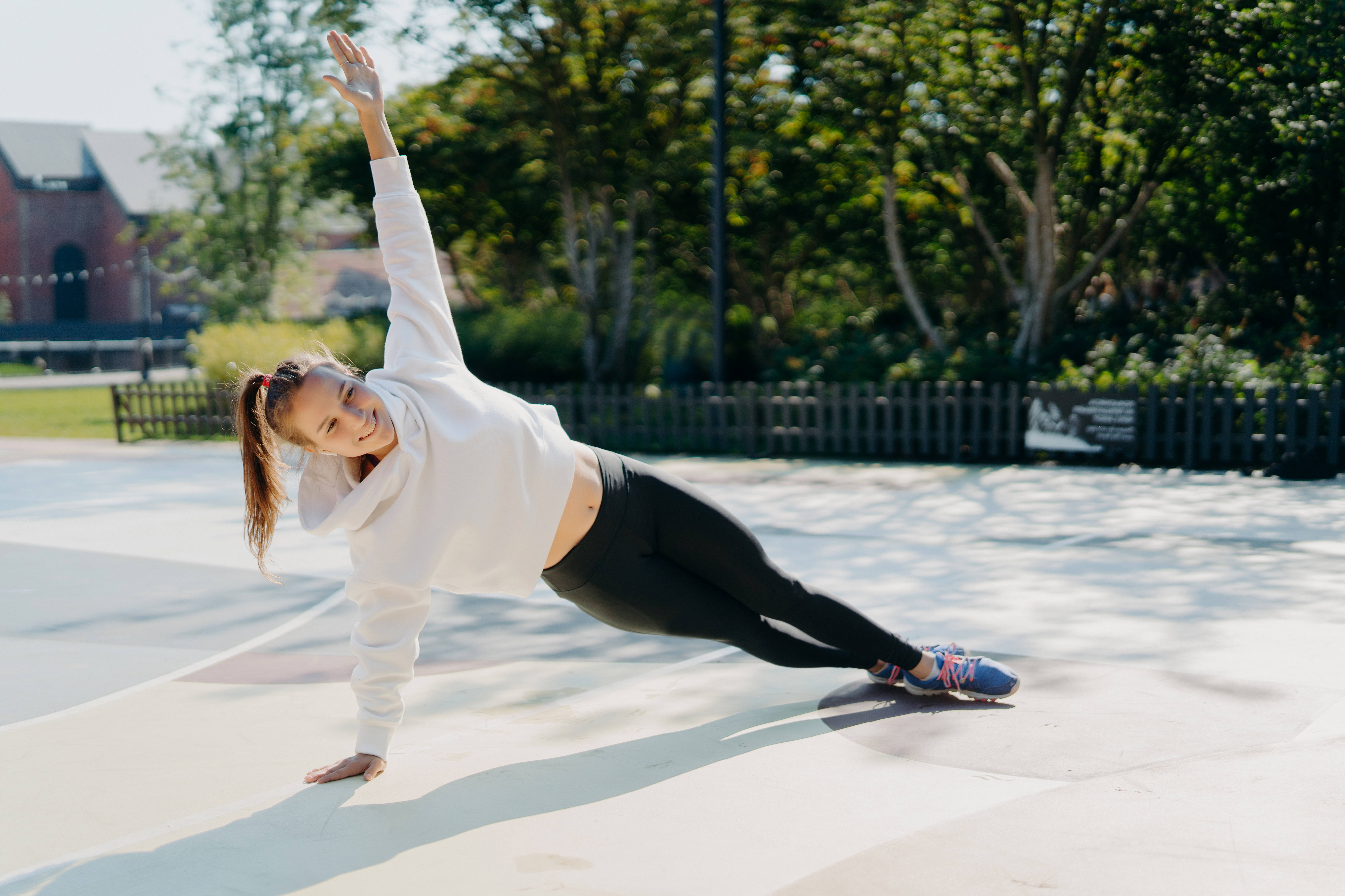 woman stands in sideways plank keeps arm raised strengthens core muscle. Photo Credit: Envato @StudioVK
