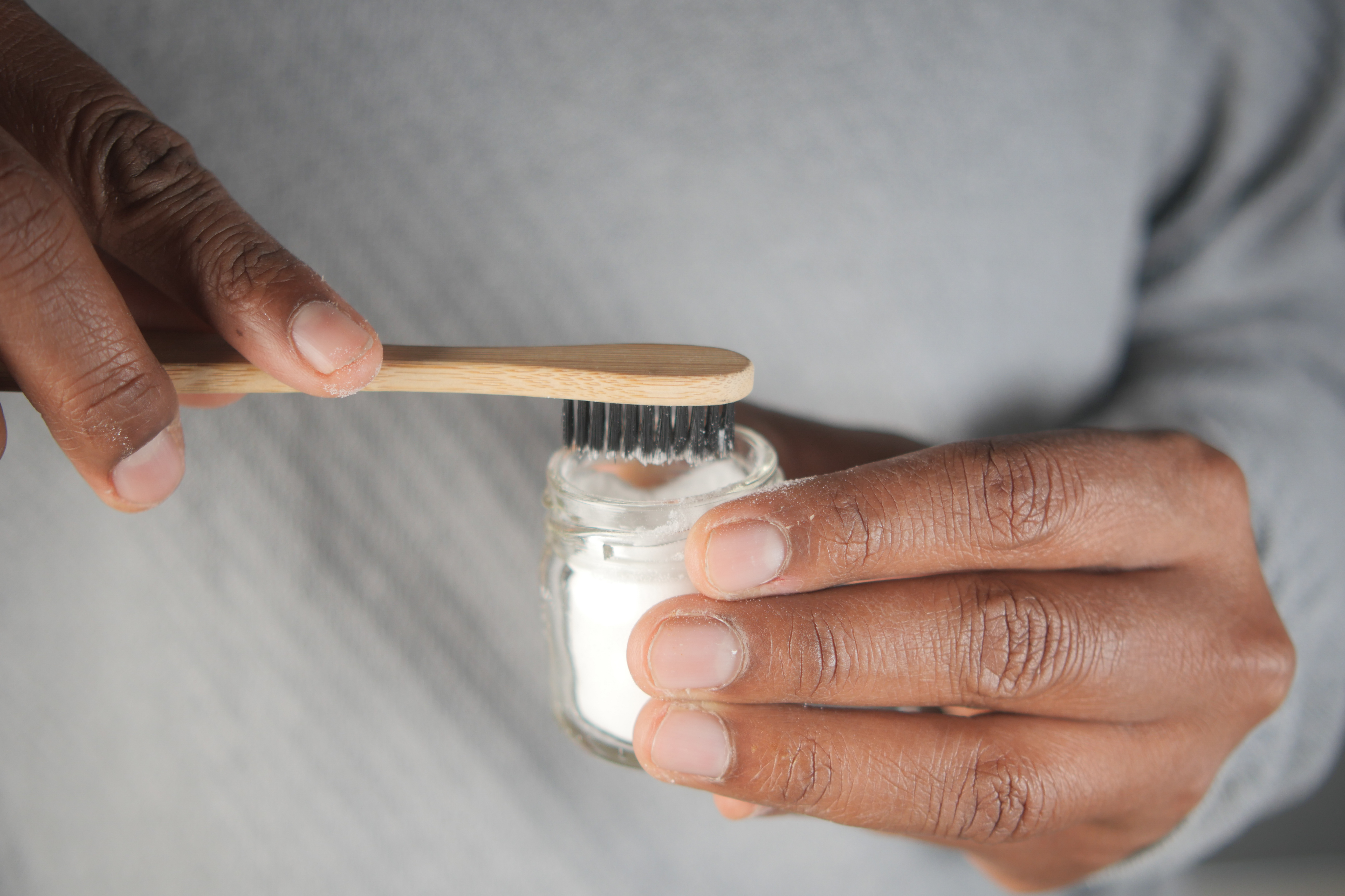 holding a jar of baking soda, a bamboo toothbrush. Photo Credit: Envato @towfiqu98