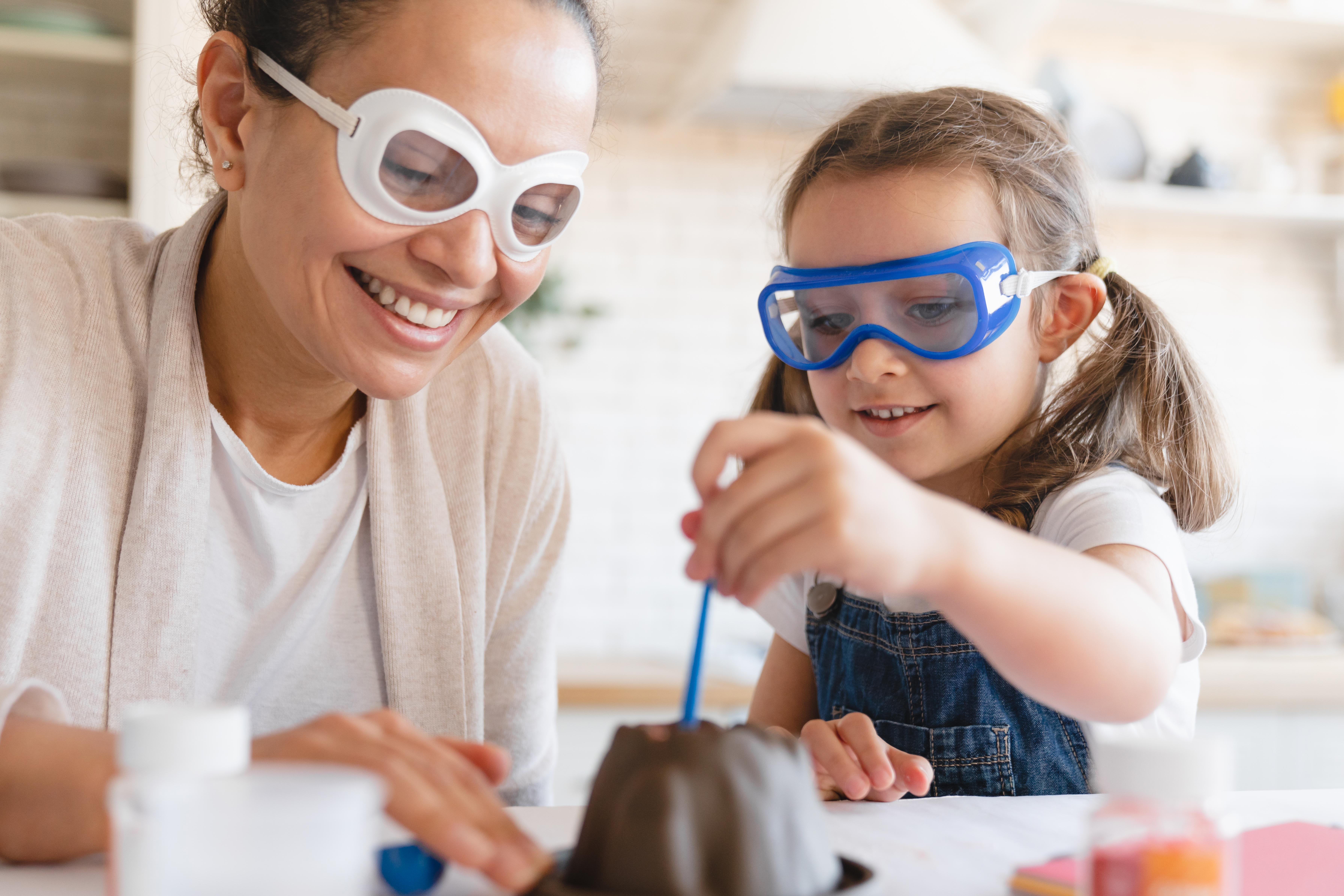 Volcanic eruption for science project homework. Mom and daughter watching chemistry experiment. Photo Credit: Envato @insidecreativehouse