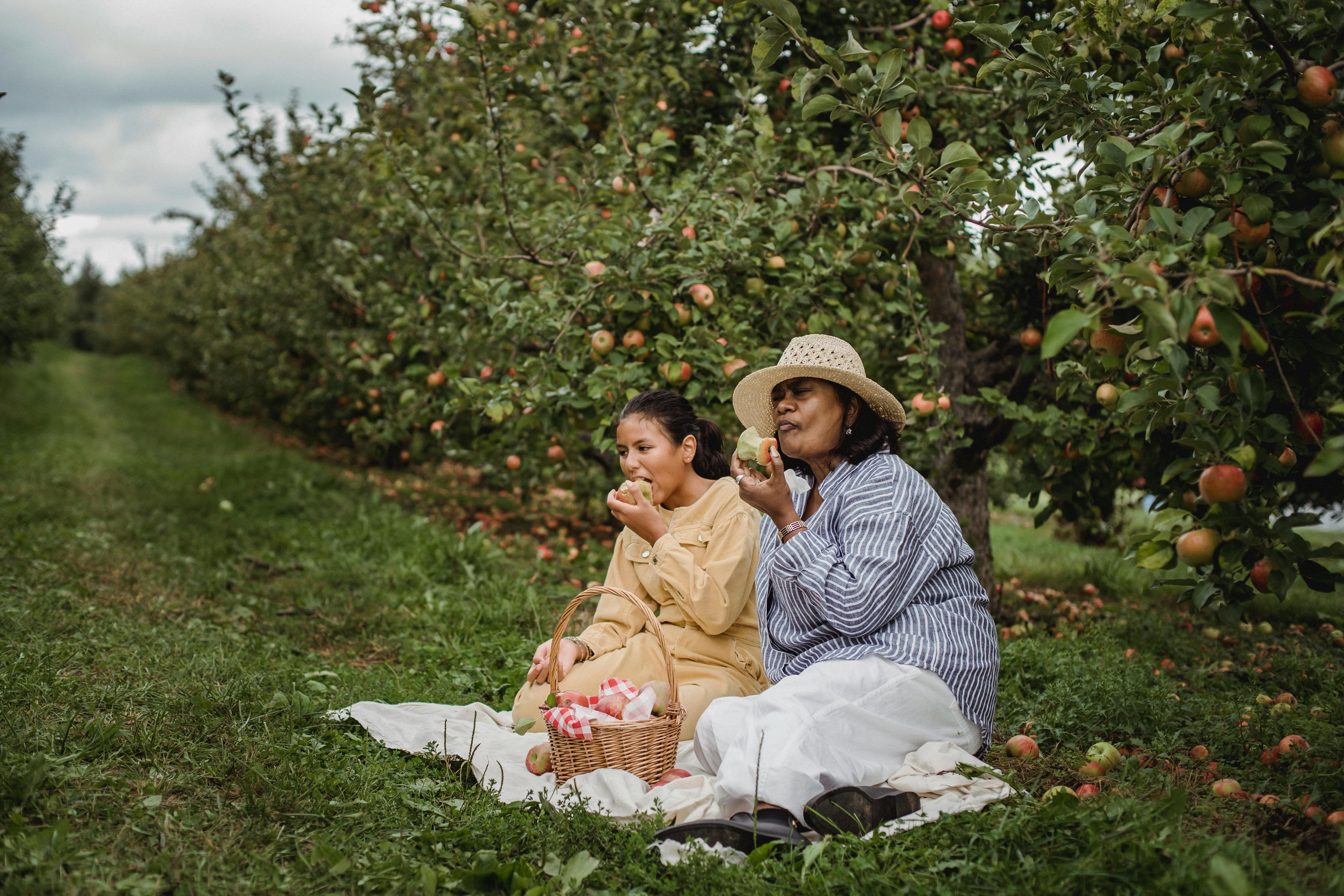 Middle aged ethnic female with short hair in t shirt peeling fresh apple and preparing salad while sitting at table with veggies and various medicine during remission. Photo Credit: Pexels @Michelle Leman