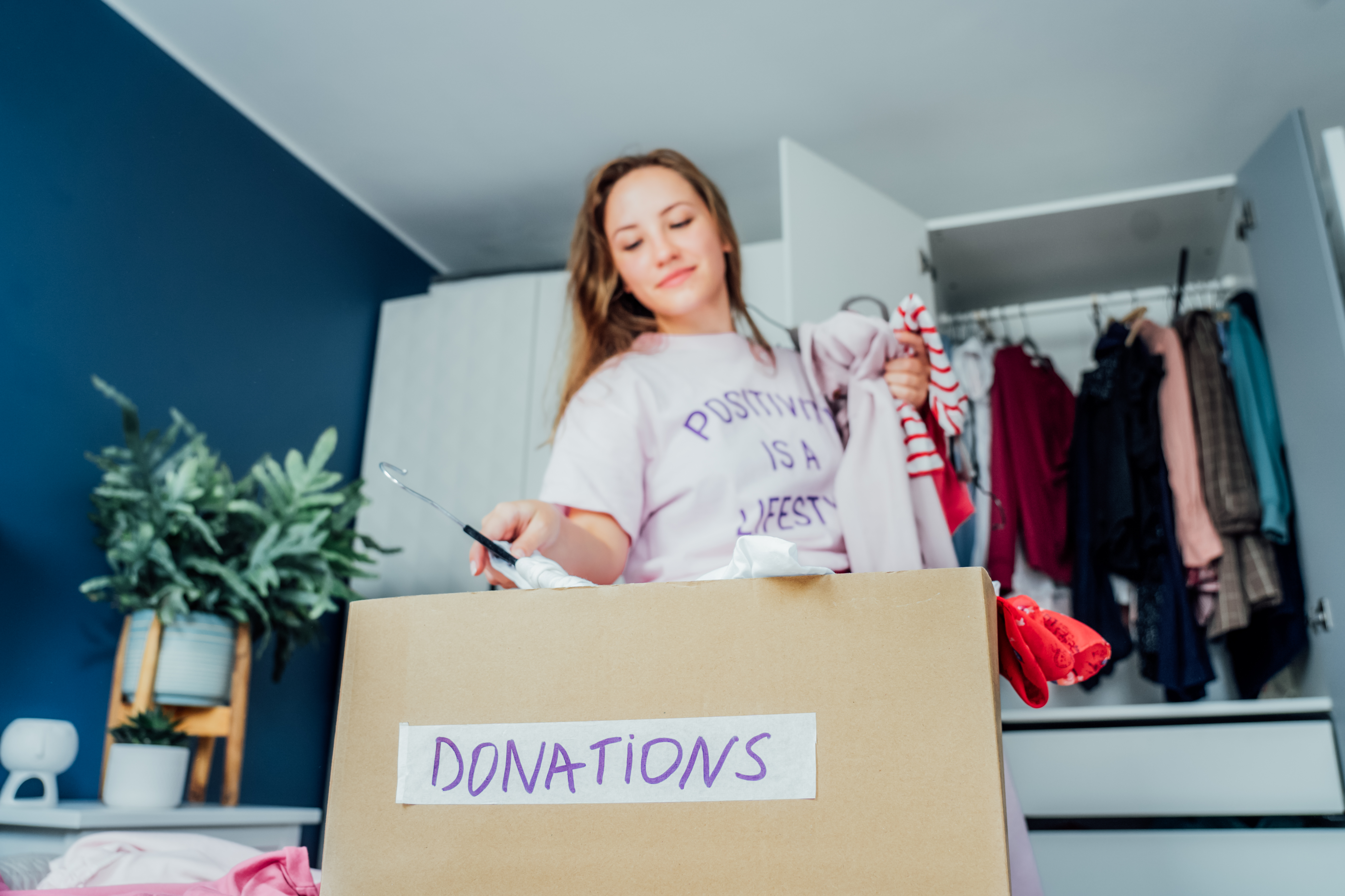 A cardboard box of selected clothes for donating to a Charity shop standing on the bed. Decluttering. Photo Credit: Envato @Okrasyuk
