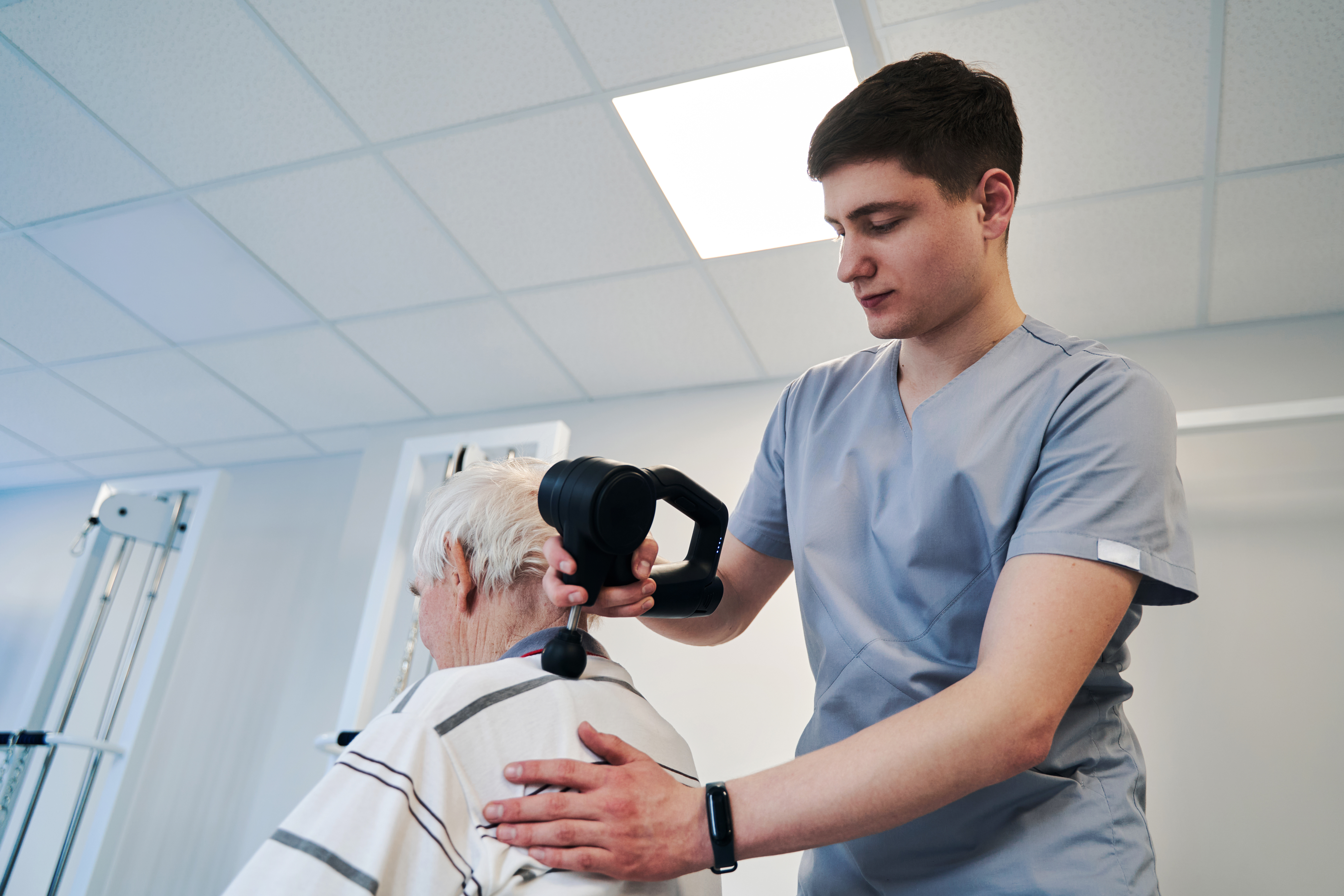 Orthopedist delivering blows to pensioner neck with percussion massager. Photo Credit: Envato @svitlanah