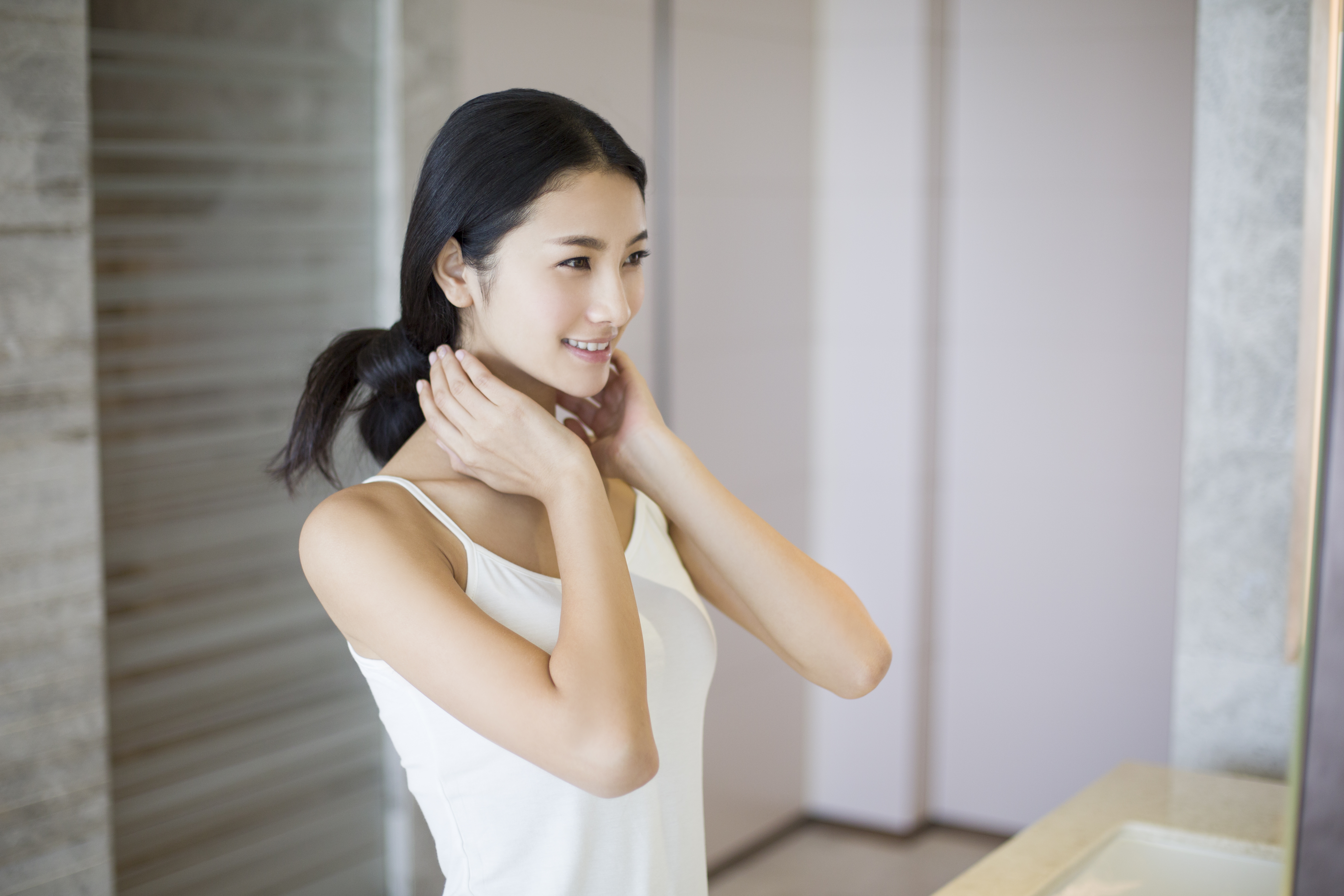 Young woman rubbing neck. Photo Credit: Envato @bluejeanimages