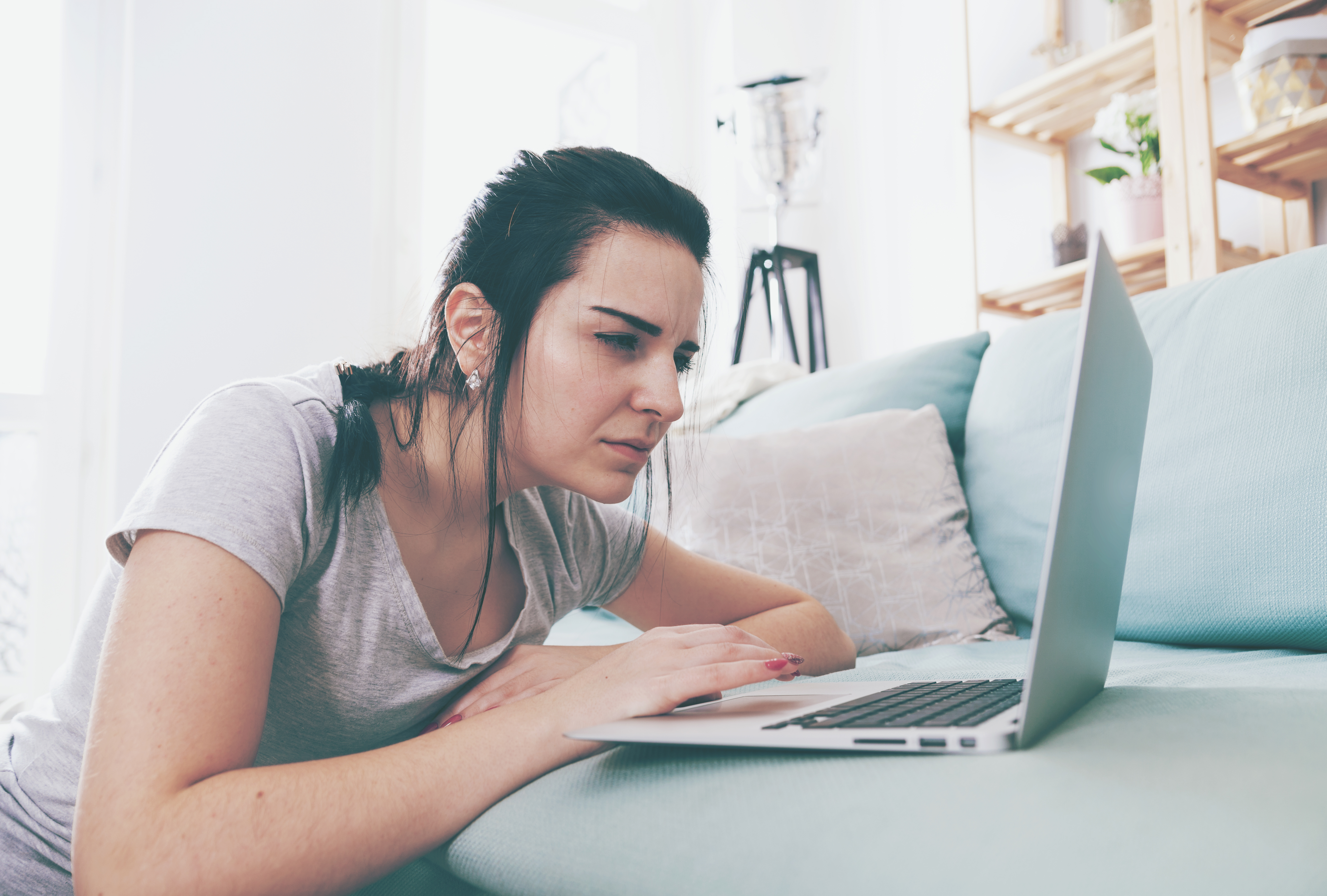 Woman with vision problems using laptop at home. Photo Credit: Envato @leszekglasner