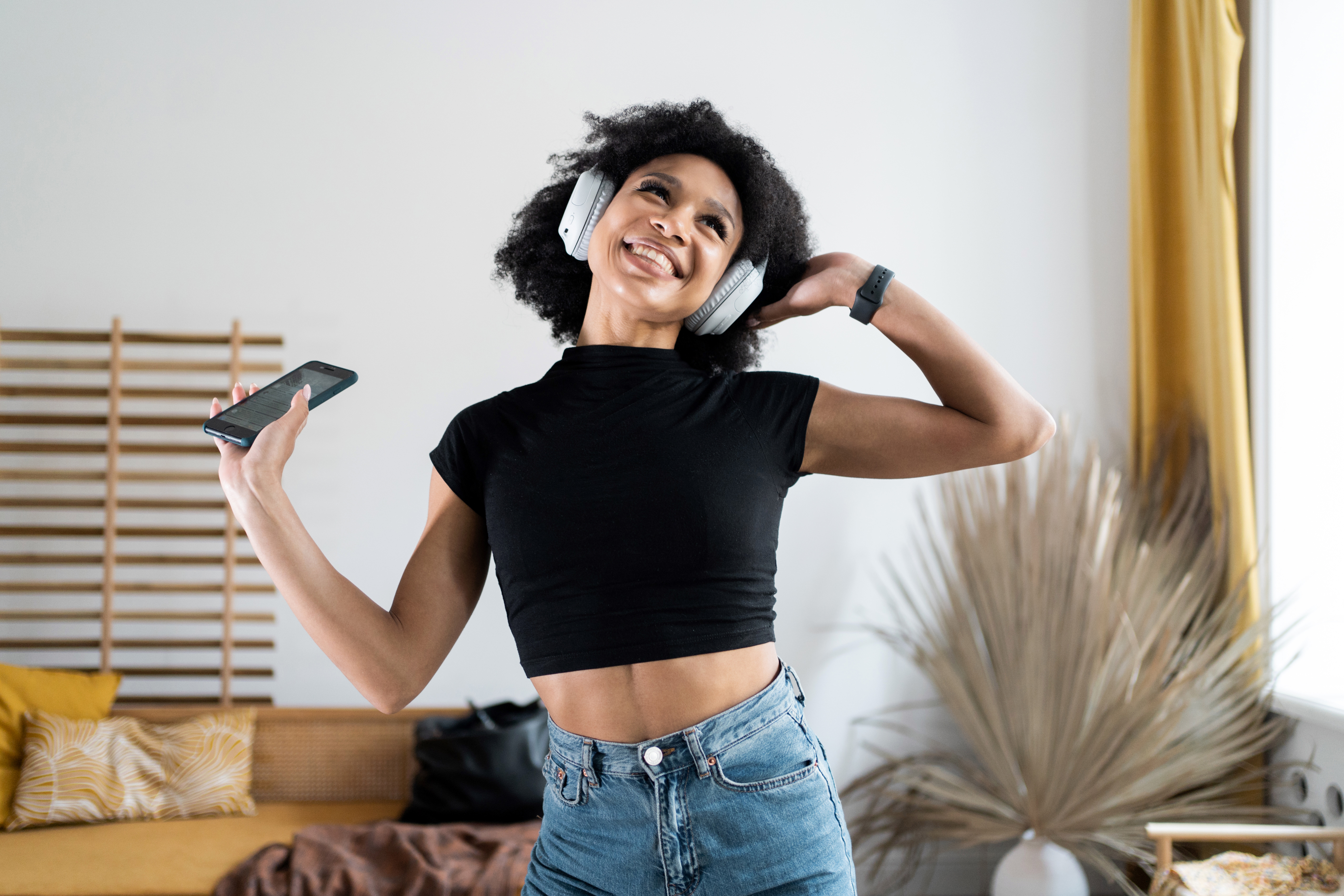 woman dancing listening to music with headphones. Photo Credit: Envato @denismuse777