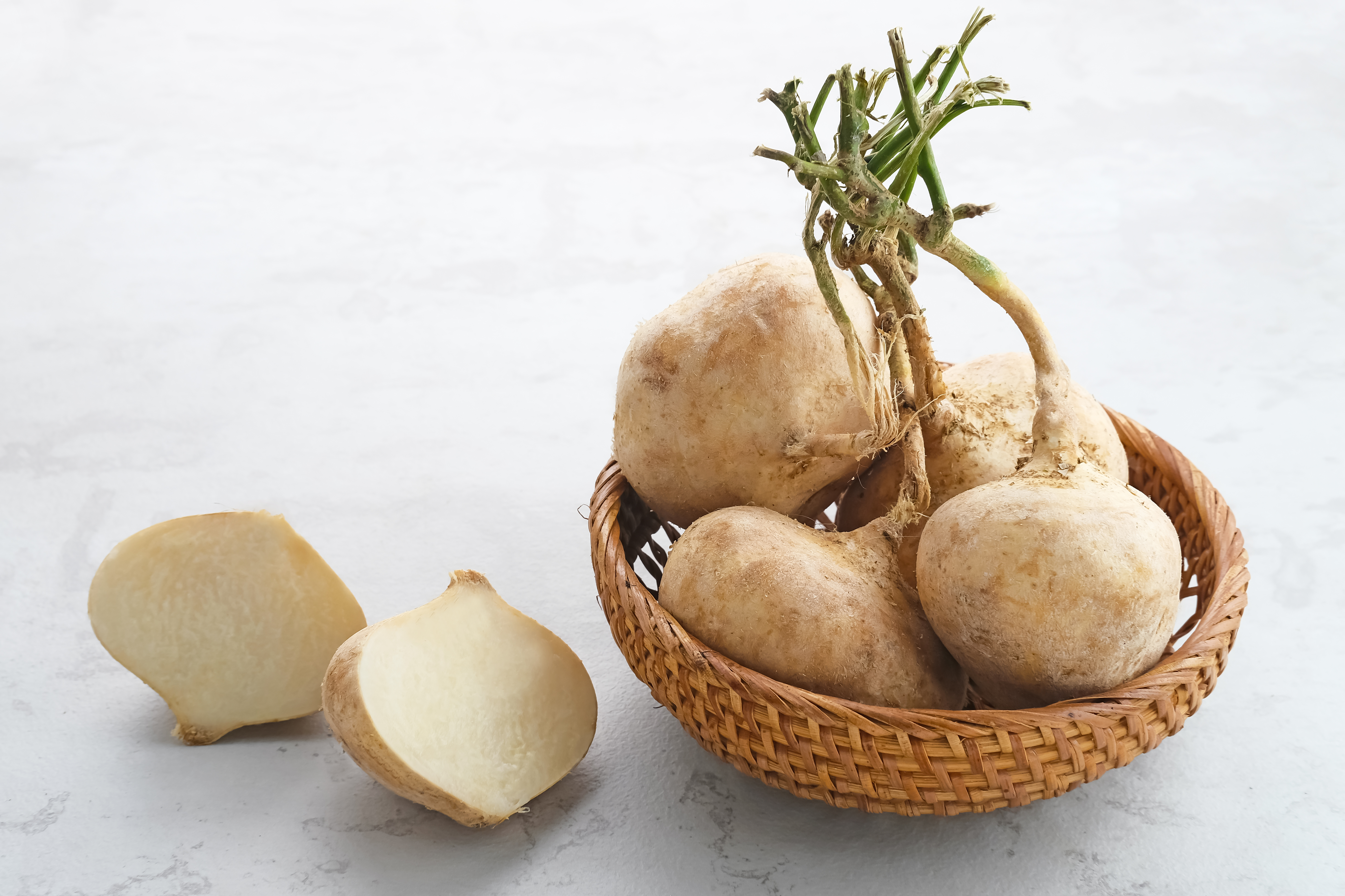 Discover the refreshing crunch and gut benefits of jicama! This versatile root vegetable is loaded with inulin fiber, making it an excellent prebiotic food source. Eating jicama helps fuel beneficial bacteria, promoting a diverse and healthy microbiome, which is linked to better digestion, stronger immunity, and even improved mood. It's also high in vitamin C and low in calories. Enjoy jicama raw sticks dipped in guacamole or hummus, shred it into salads or slaws for extra crunch, or add it to stir-fries for a subtly sweet, gut-nourishing boost.