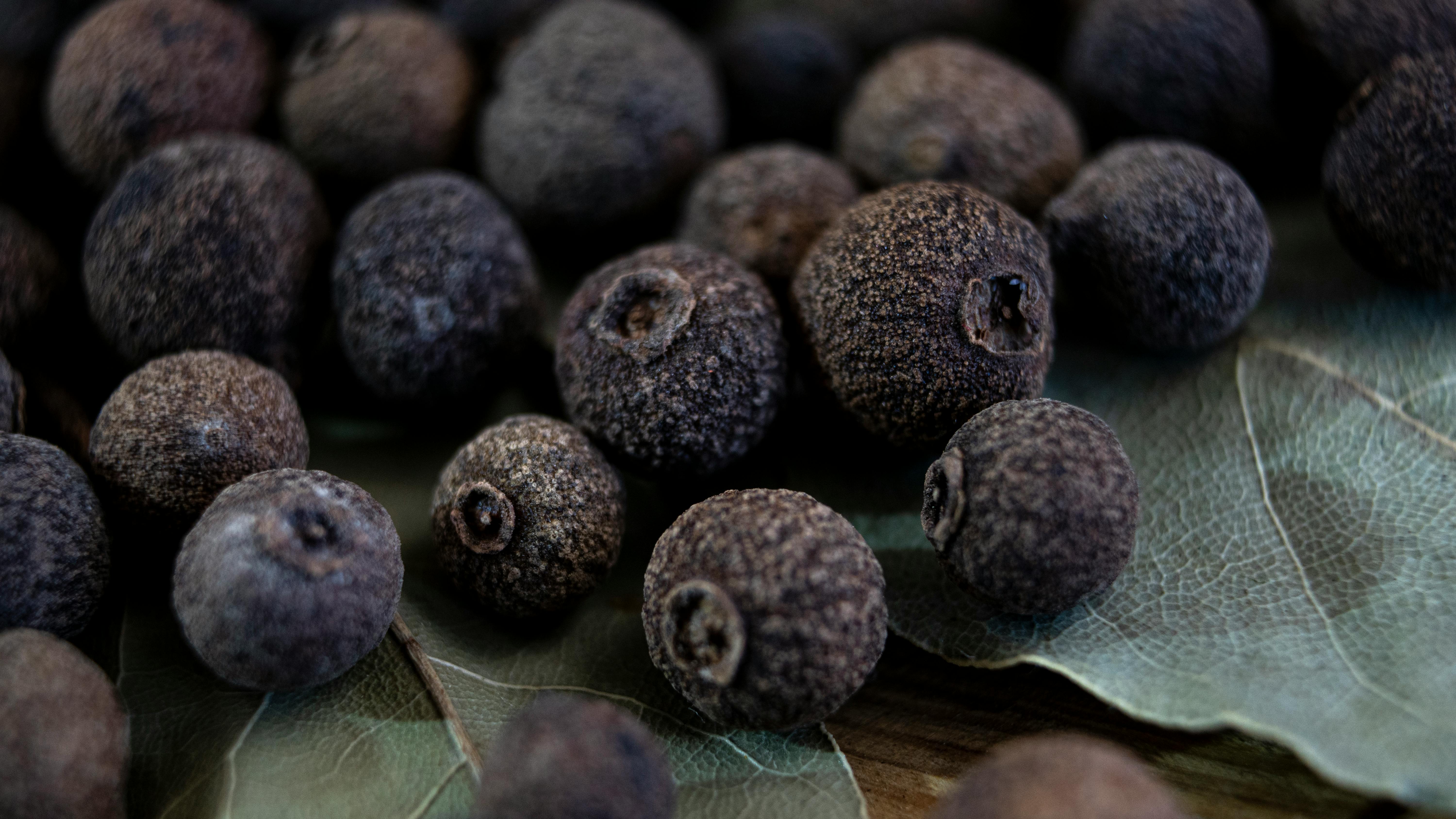 A macro shot of dried allspice berries scattered over fresh bay leaves, highlighting their texture. Photo Credit: Pexels @TimePRO TV