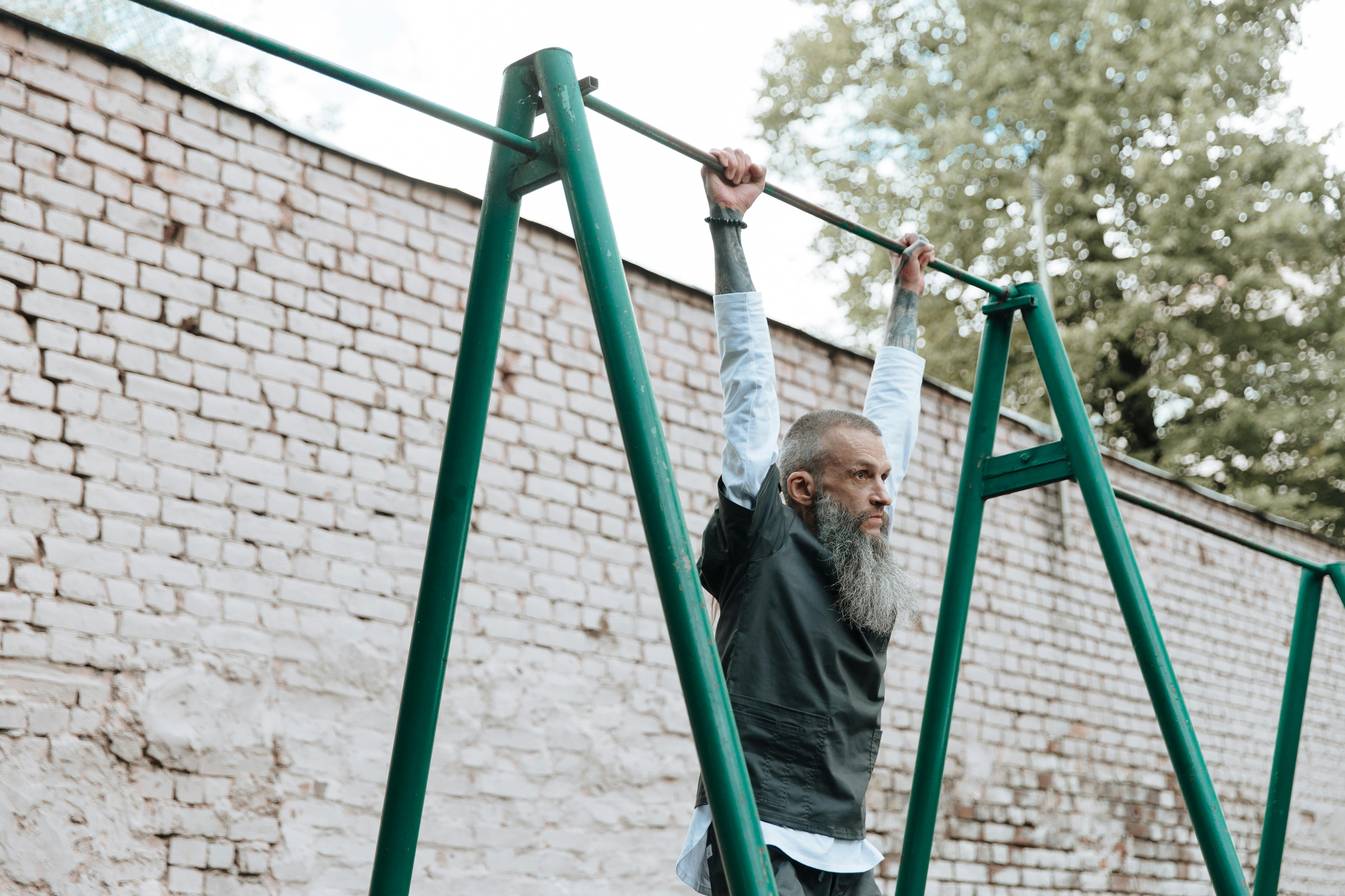 Bearded man exercising by hanging on monkey bars outdoors in a playground area. Photo Credit: Pexels @Ron Lach
