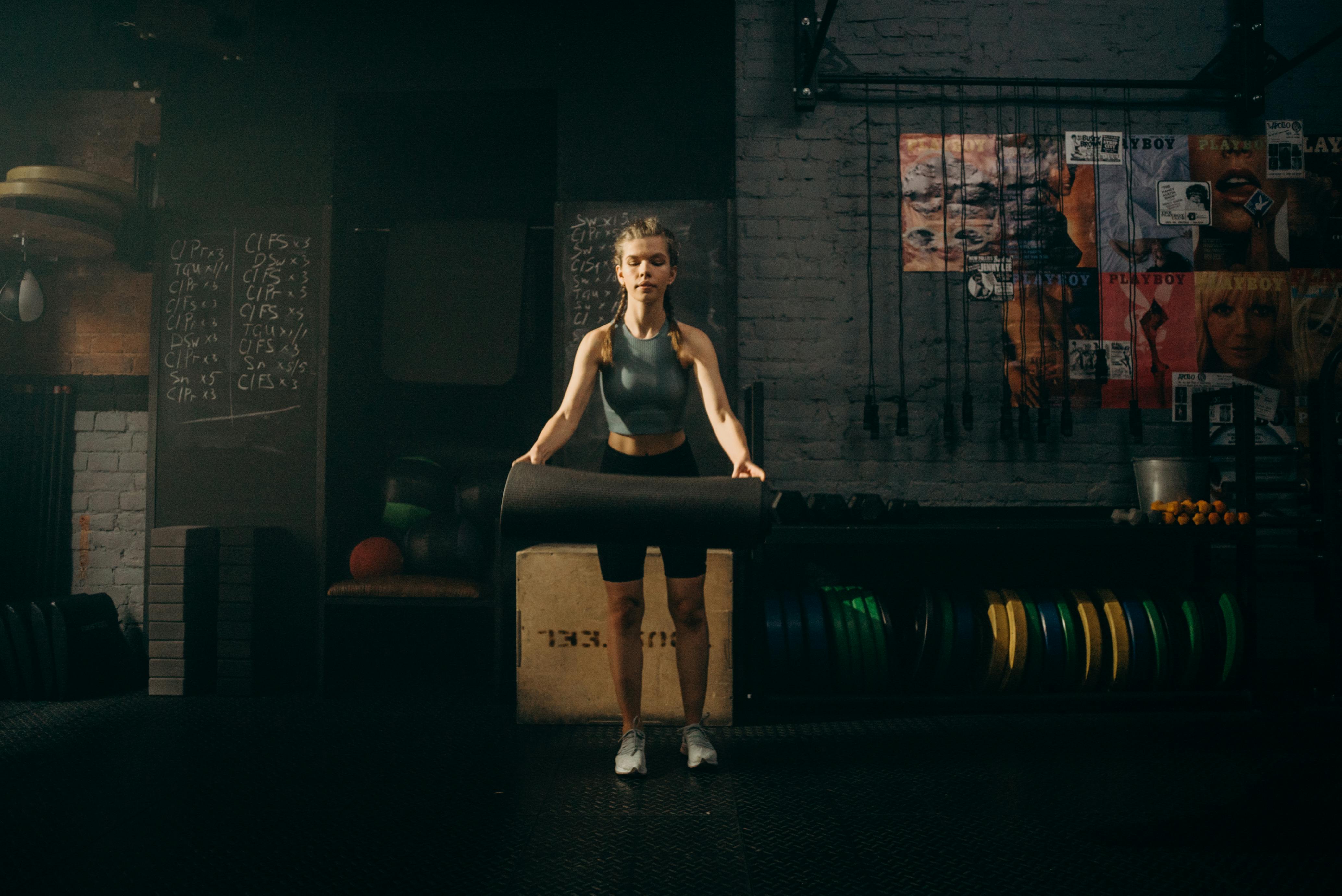 A woman stands in an industrial-style gym, unrolling a yoga mat for her workout. Photo Credit: Pexels @cottonbro studio