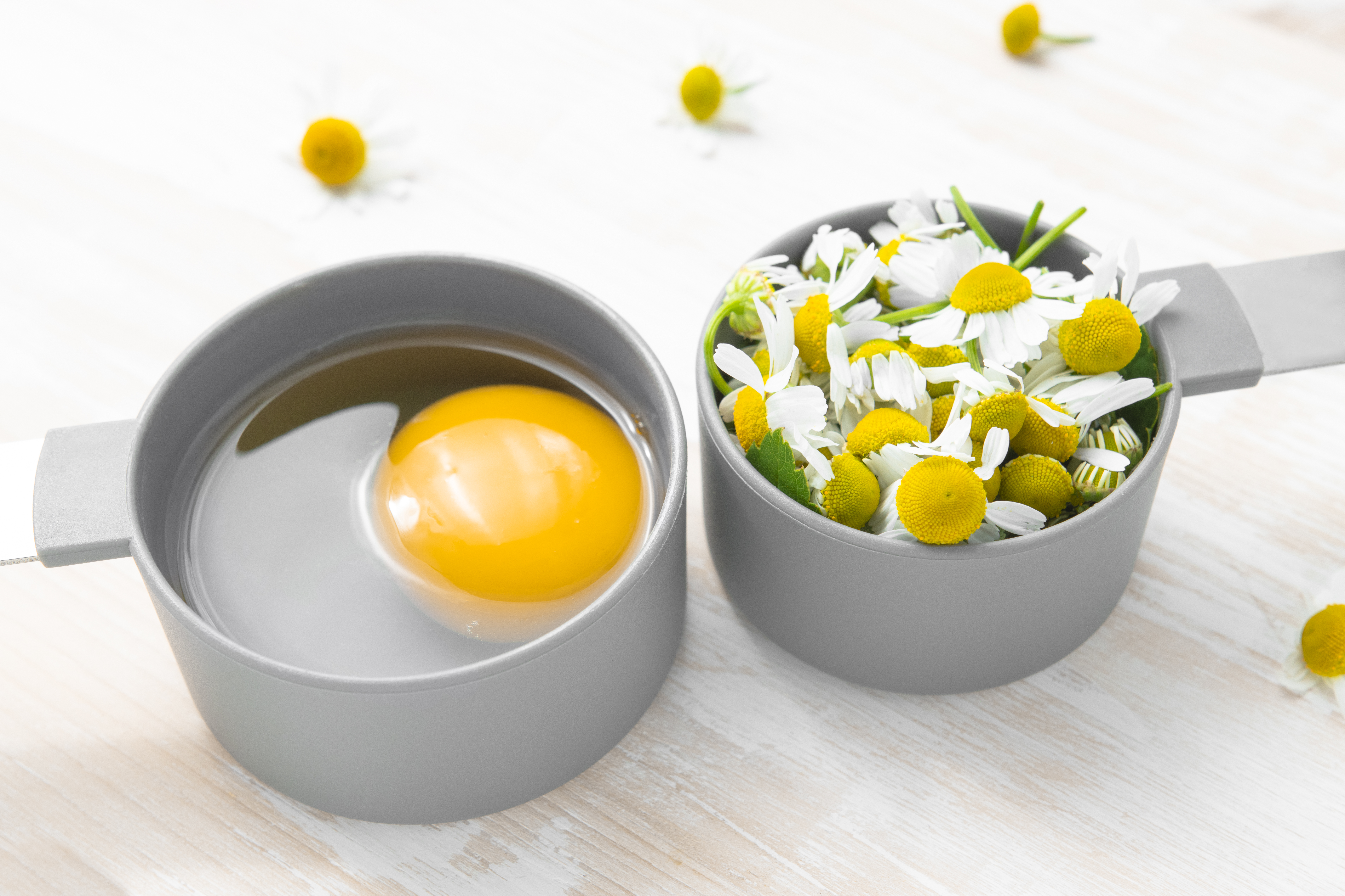 Ingredient for natural homemade cosmetics. Egg and chamomile for hair care. Photo Credit: Envato @juliacherk