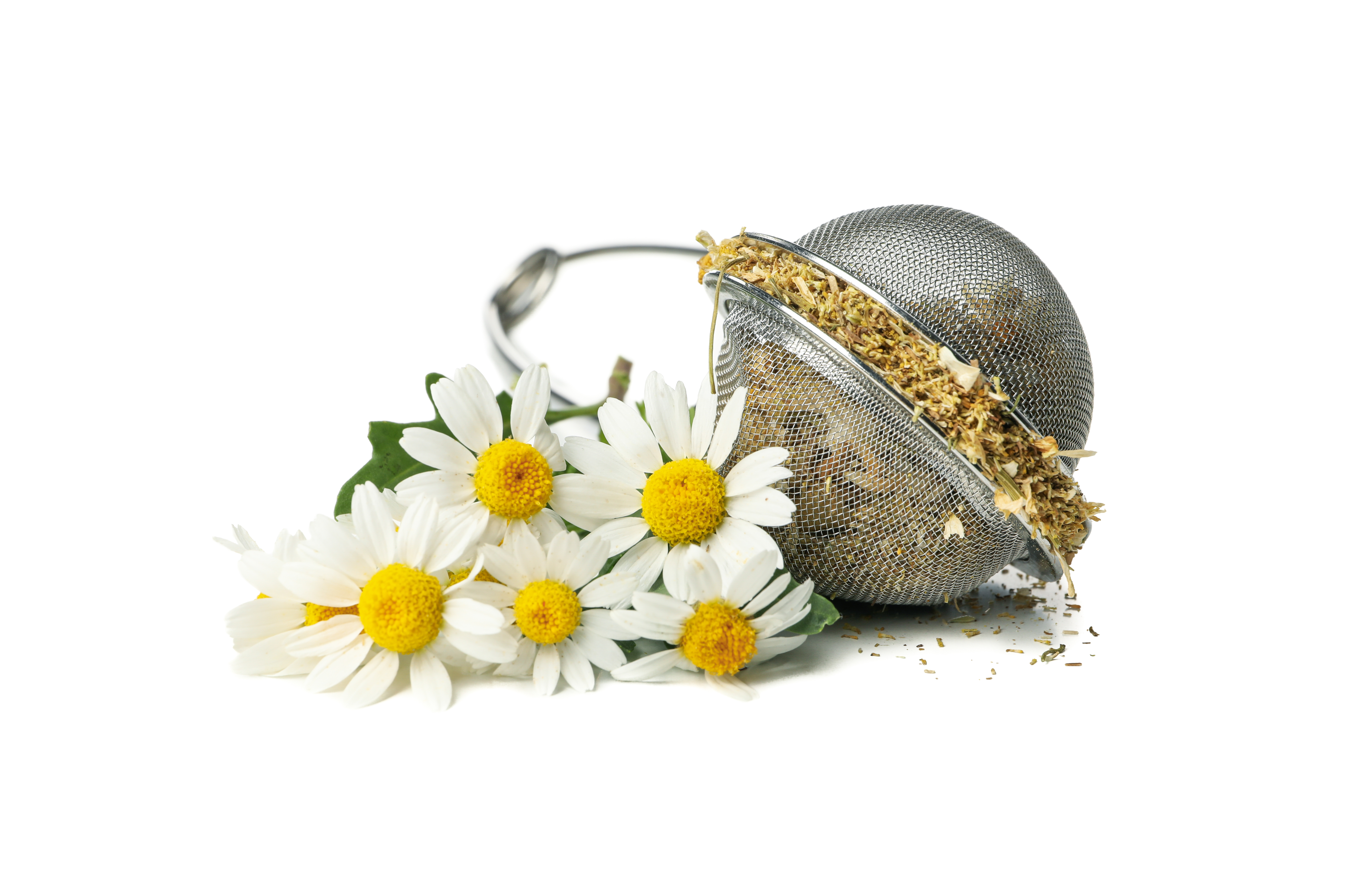 Sieve with dried chamomile isolated on white background. Photo Credit: Envato @AtlasComposer