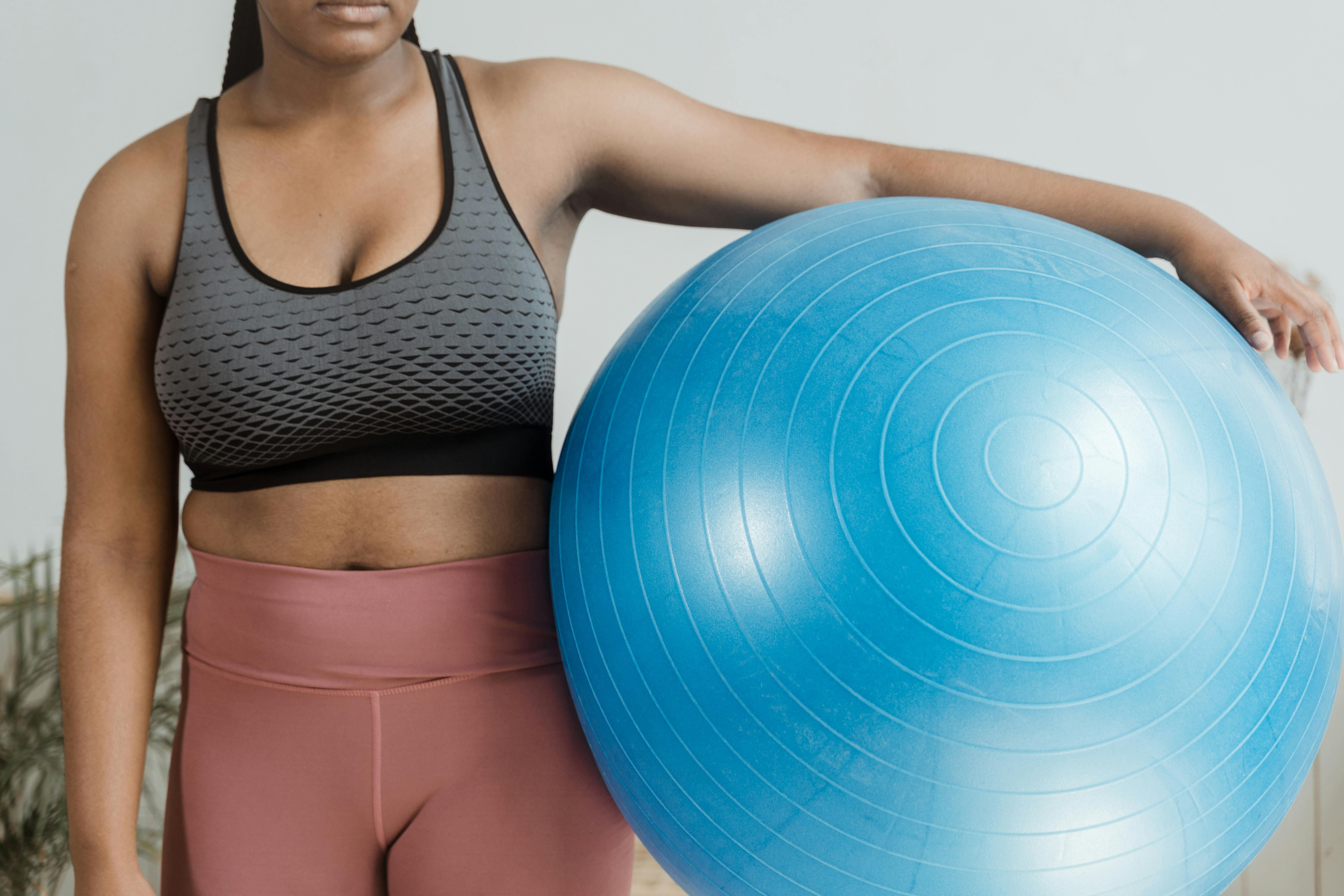 Woman in activewear posing indoors with a blue gym ball, emphasizing fitness and healthy living. Photo Credit: Pexels @MART PRODUCTION
